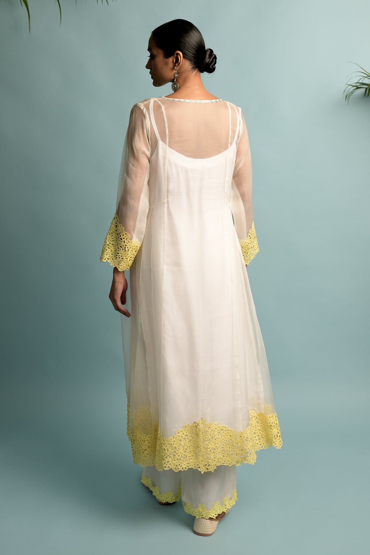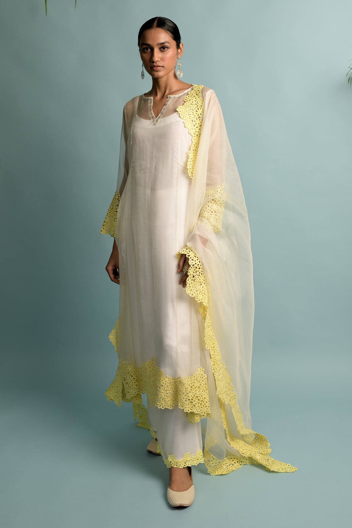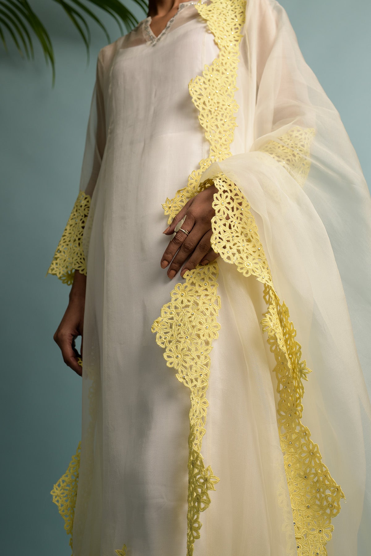 A-line organza kurta with hand cut michaelmas daisy embroidery with swarovski highlighting, lining in shantoon and dupatta in organza