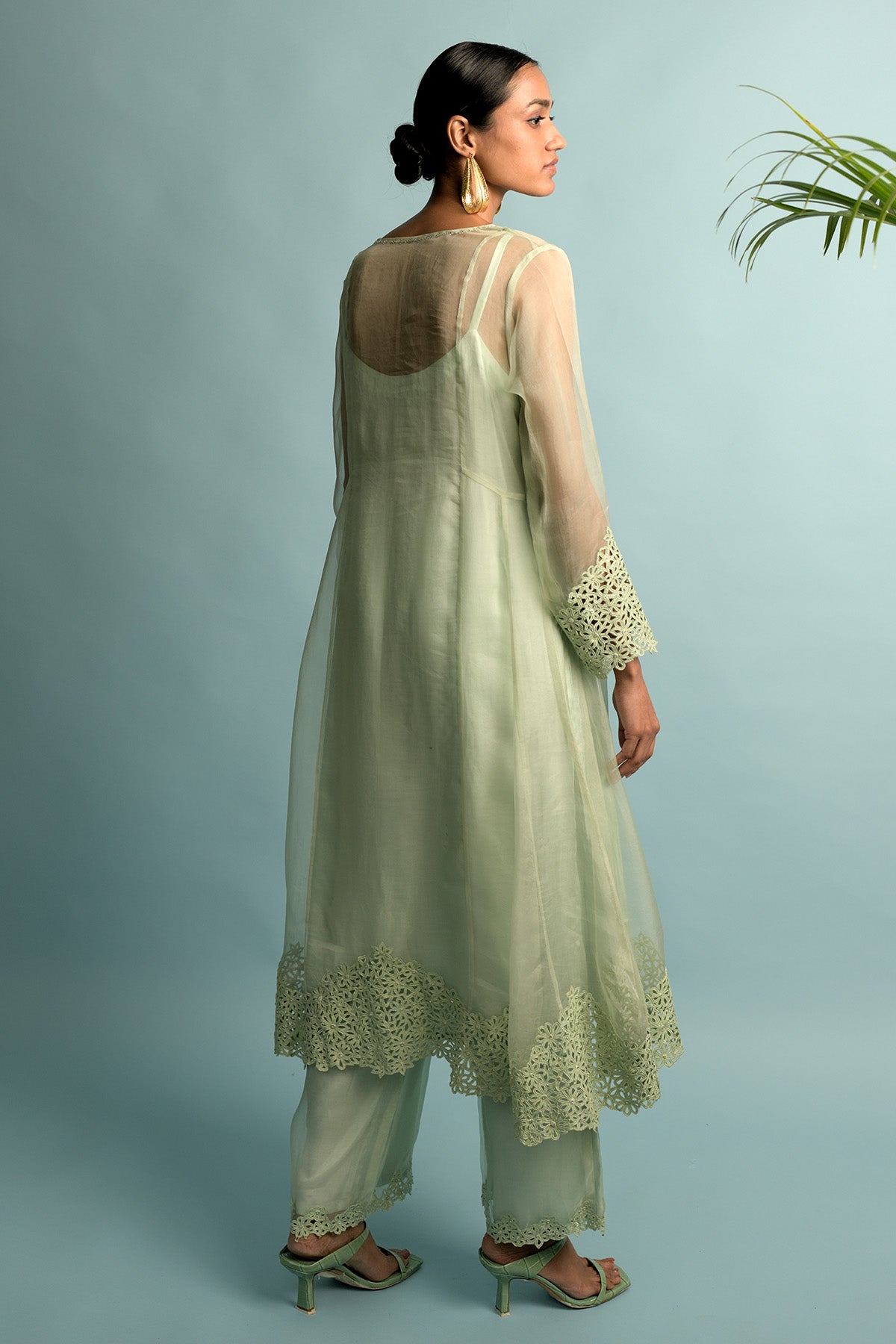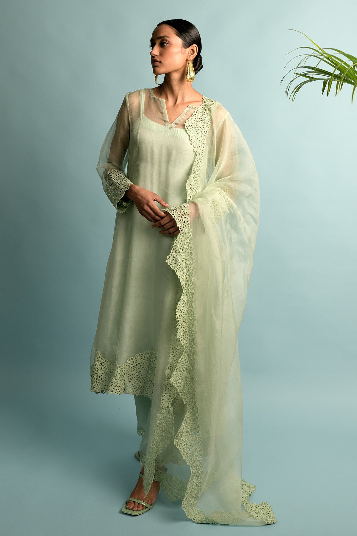 A-line organza kurta with hand cut Michaelmas daisy embroidery with Swarovski highlighting, lining in shantoon and dupatta in organza.