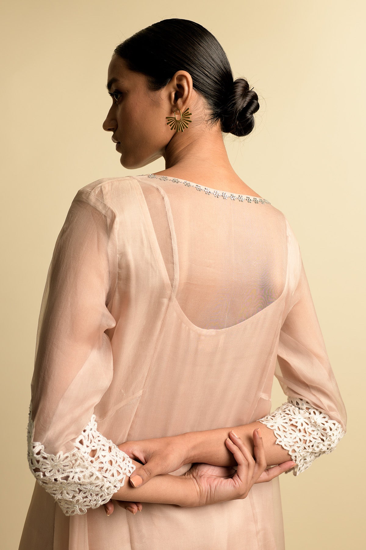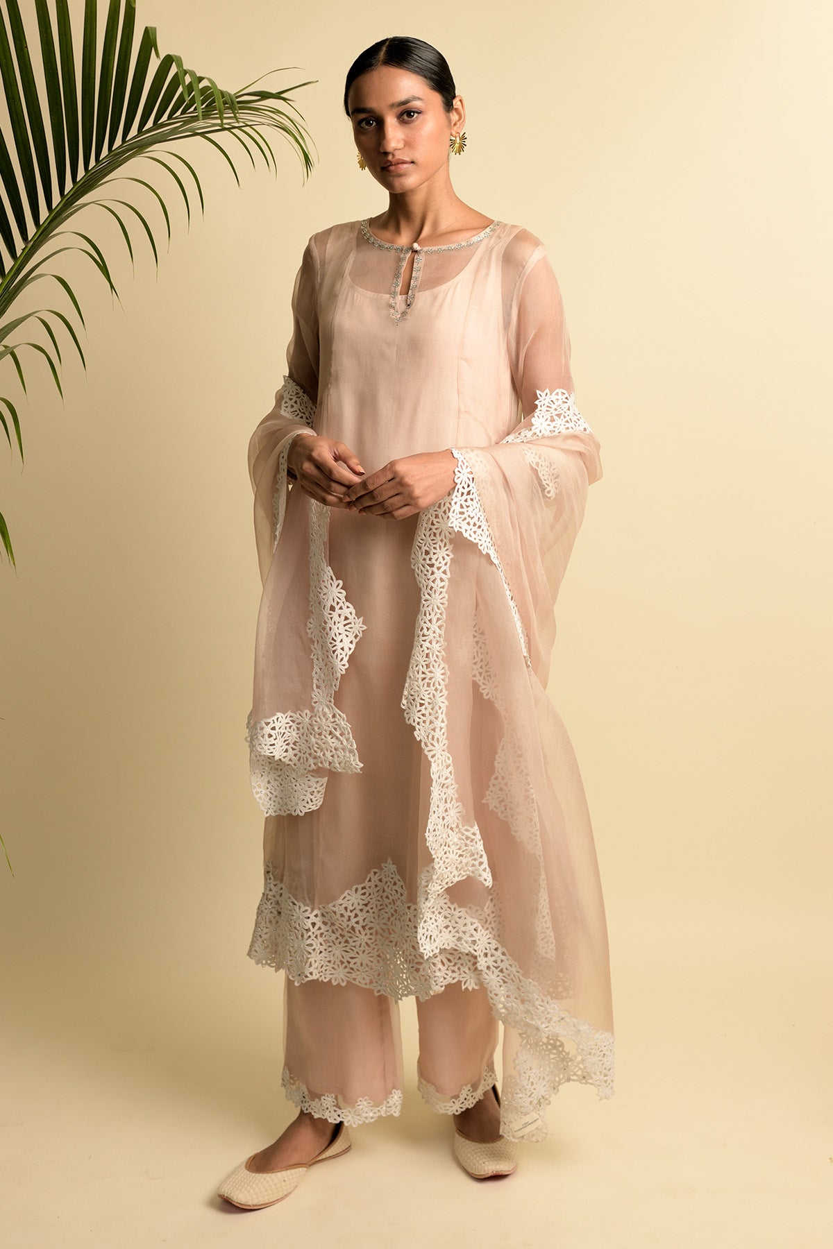 A-line organza kurta with hand cut Michaelmas daisy embroidery with Swarovski highlighting, lining in shantoon and dupatta in organza.