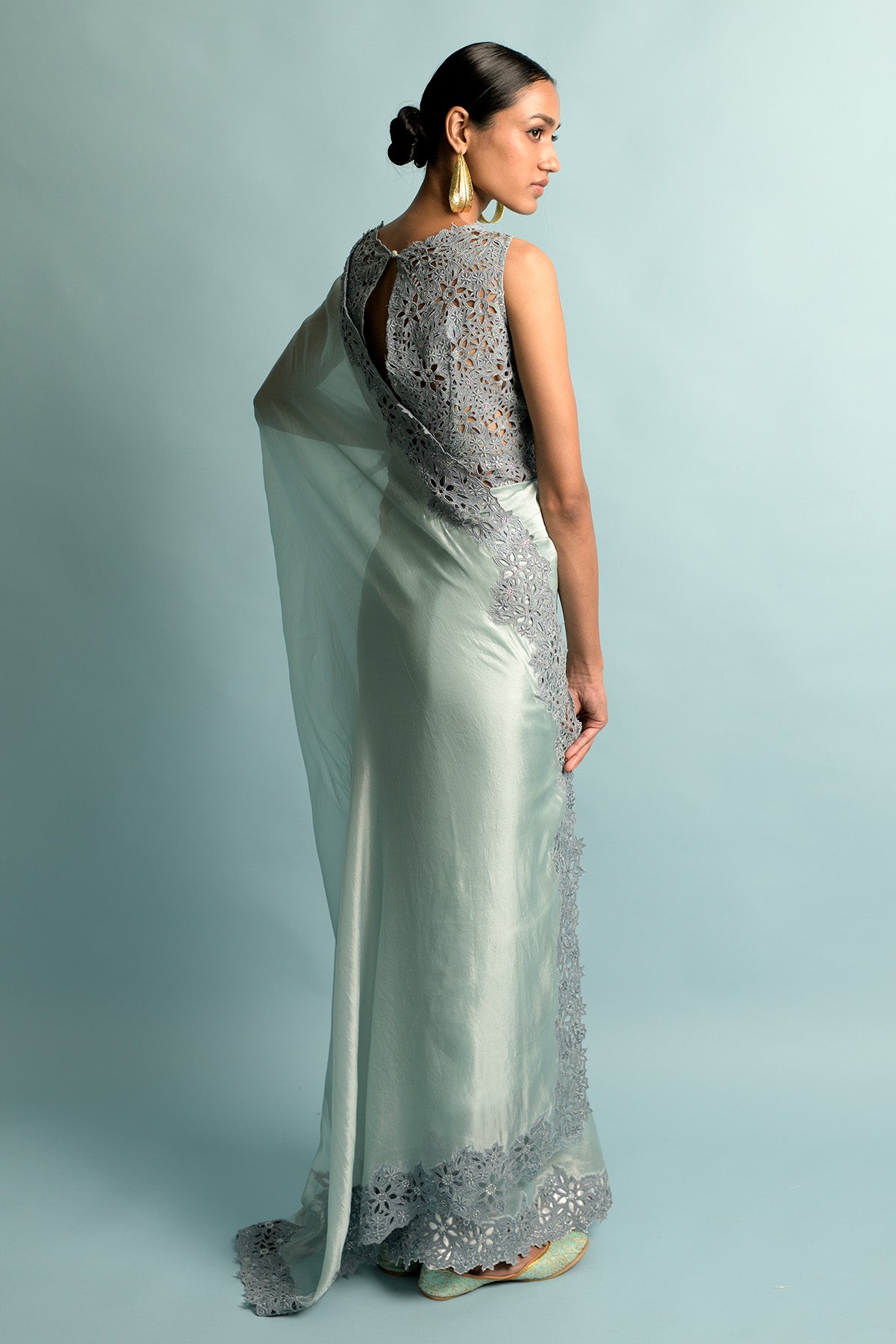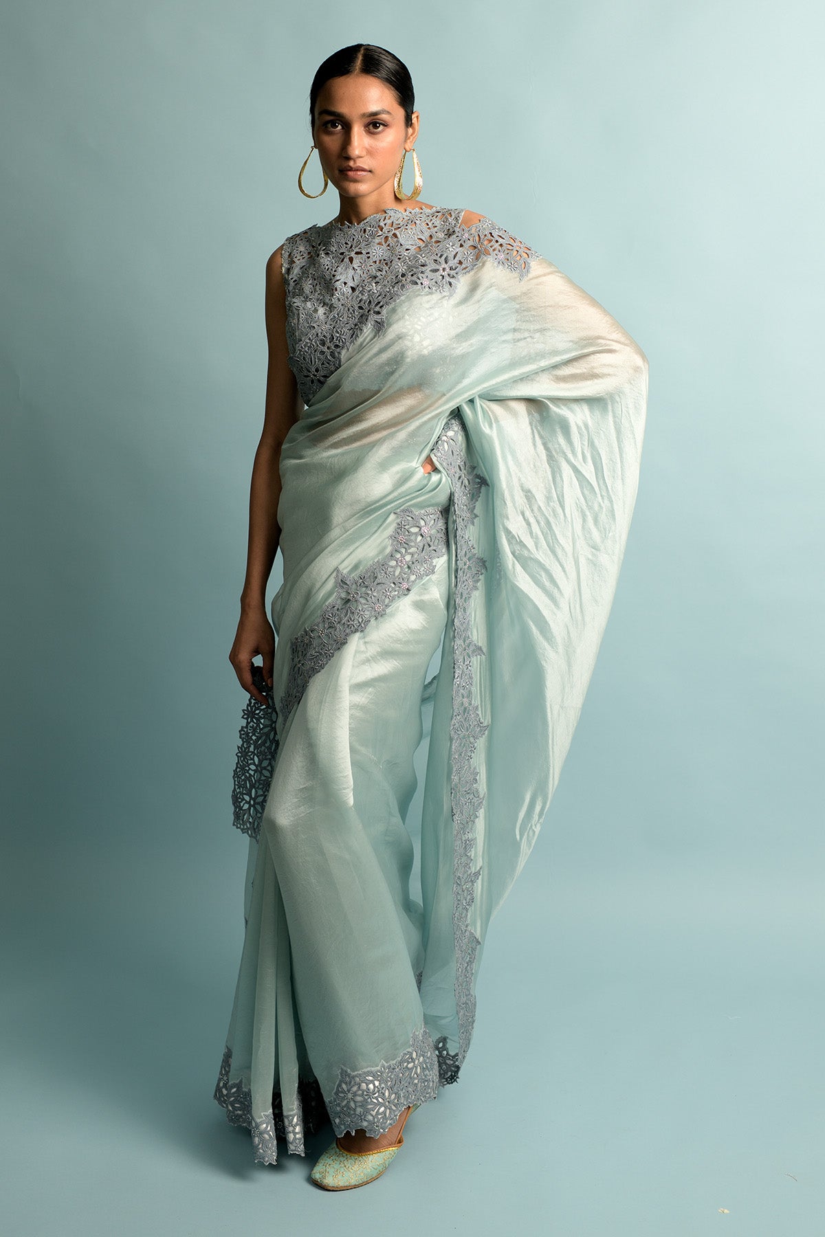 Grey blue organza saree and blouse embroidery embolden by aster flowers and highlighted with swarovski crystals and hand cut