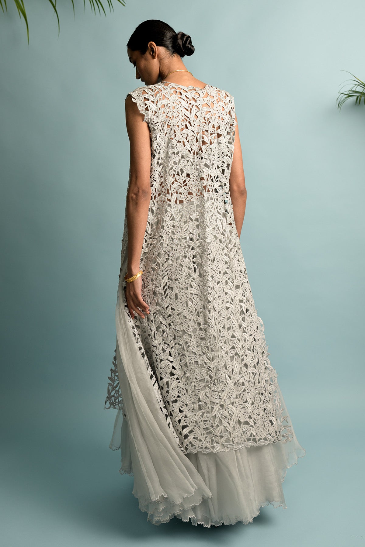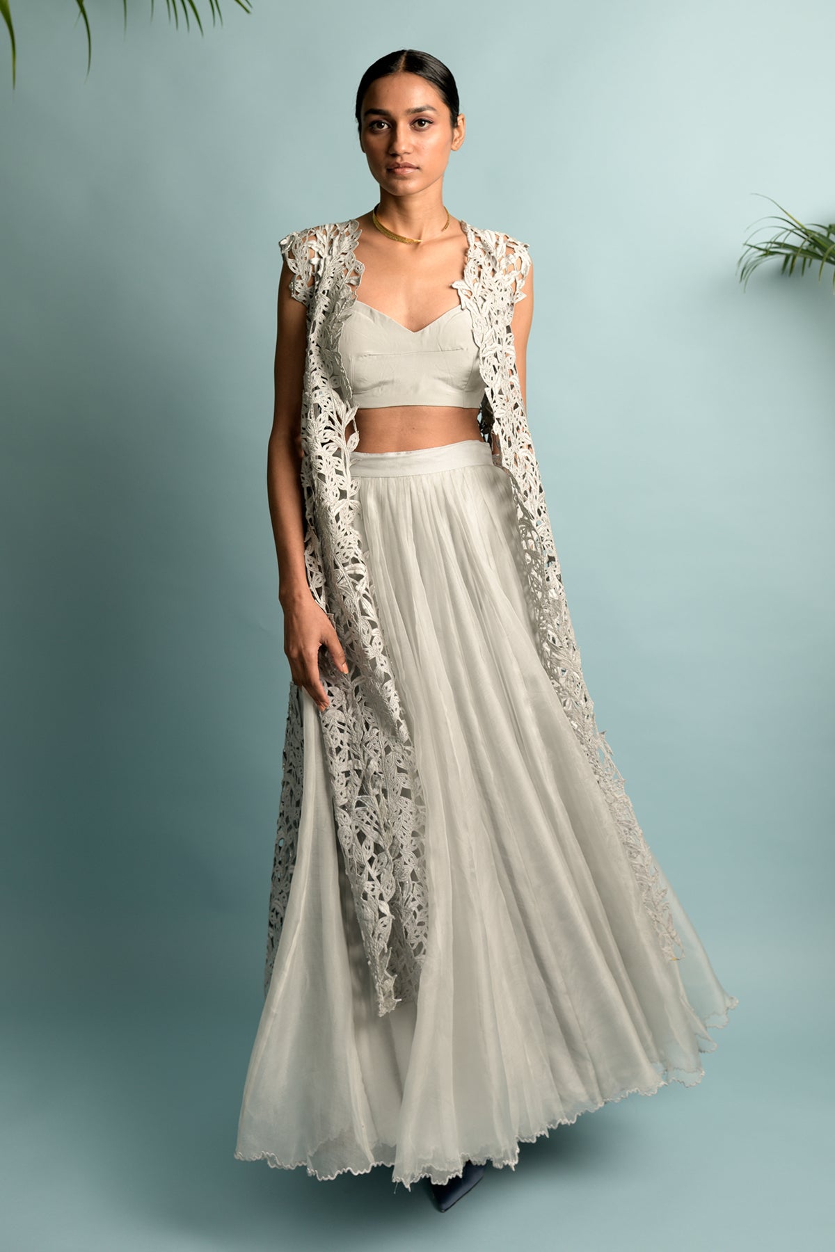 Grey sleeveless jacket with embroidery embolden by monestera vine that is hand cut, highlighted with swarovski, crepe bustier and organza skirt