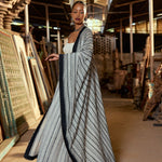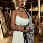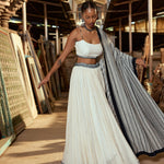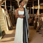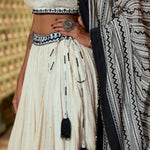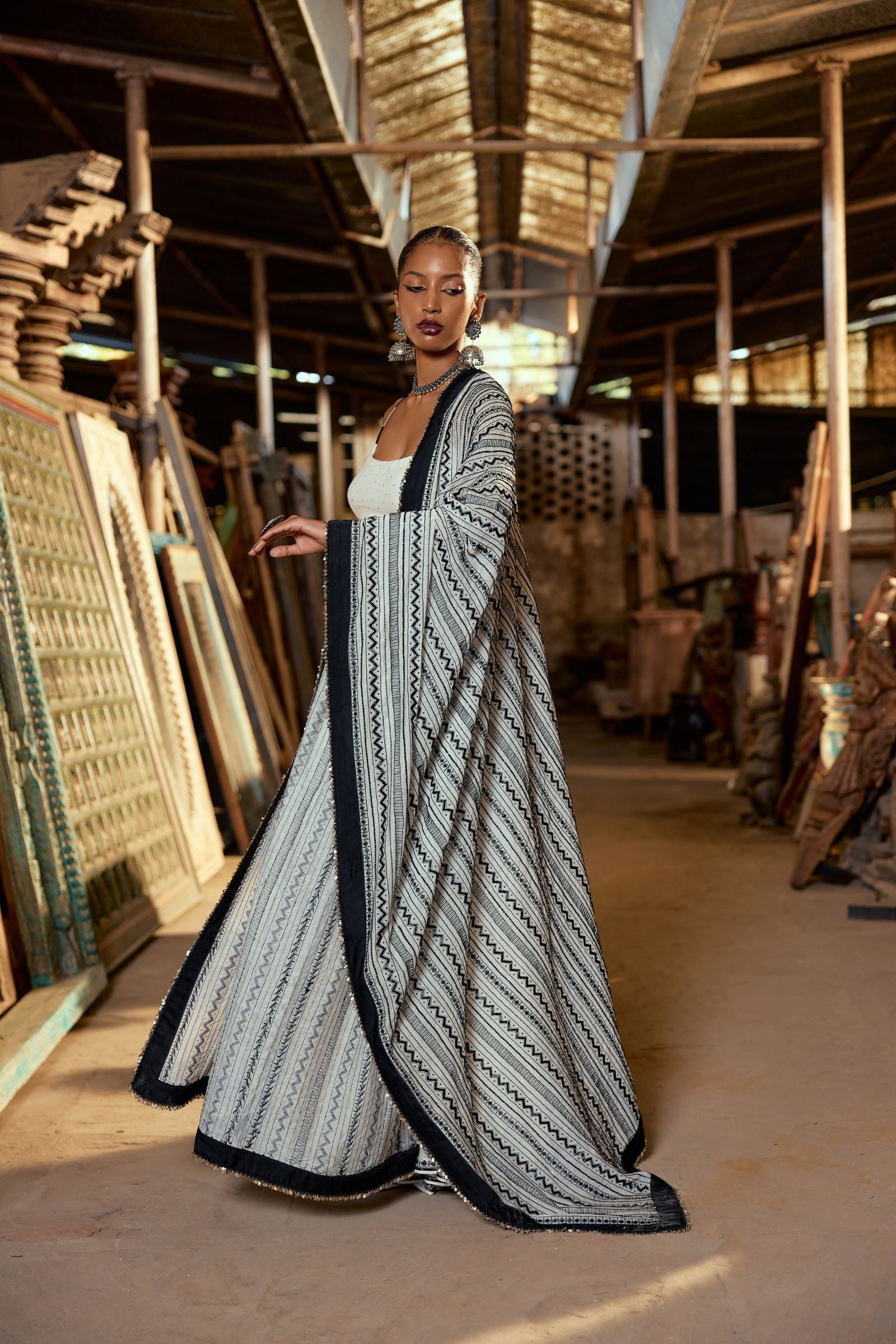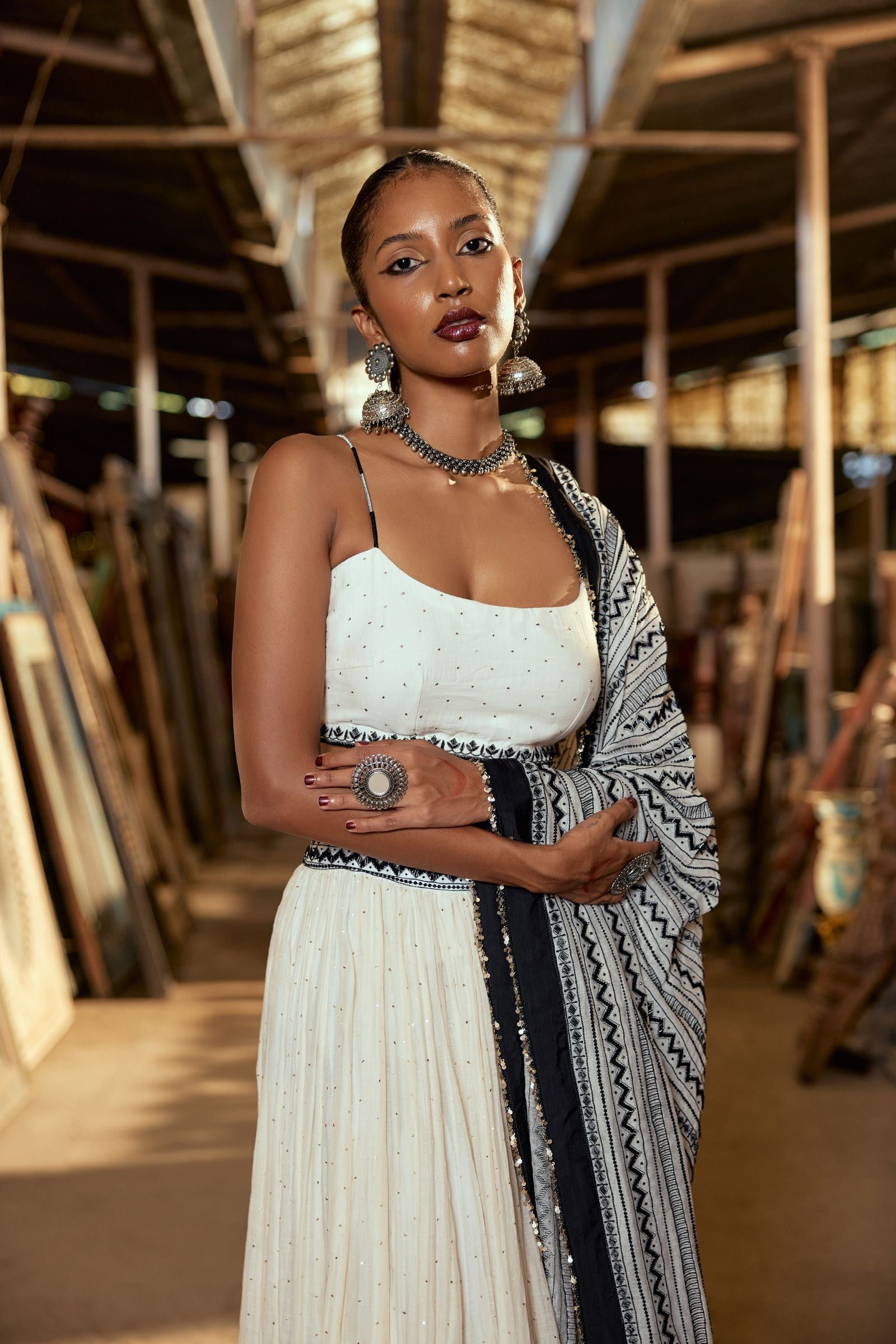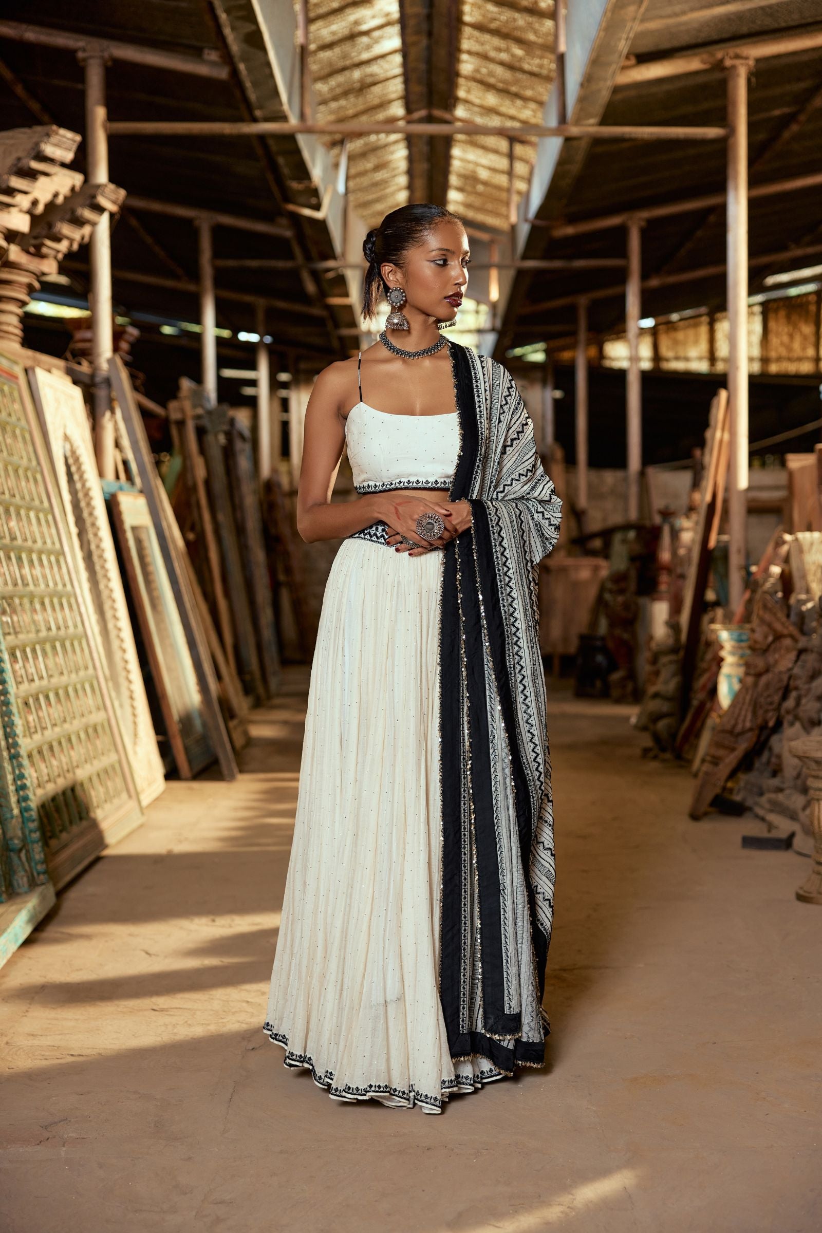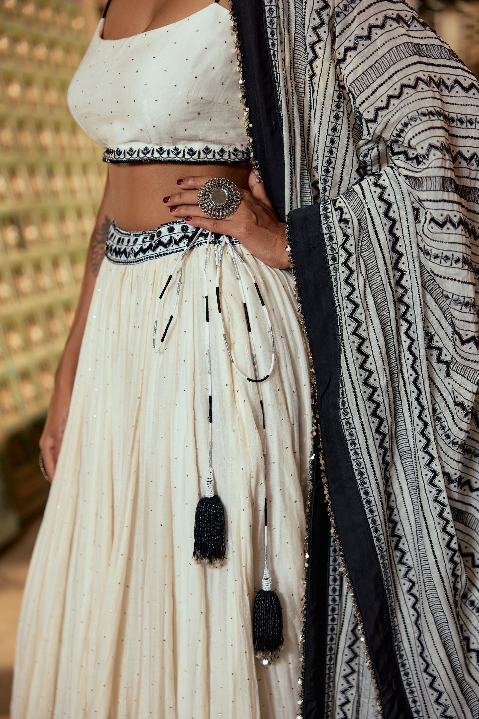 Cream mukaish chanderi lehenga with black embroidery on waist and ghera .embroidered blouse waist and black strape covered by silver zari .black cutdana , silk thread and sequence are used in embridery . Dupatta is full of embriodered geometrical shape .finish with hand made lace and tessel .
