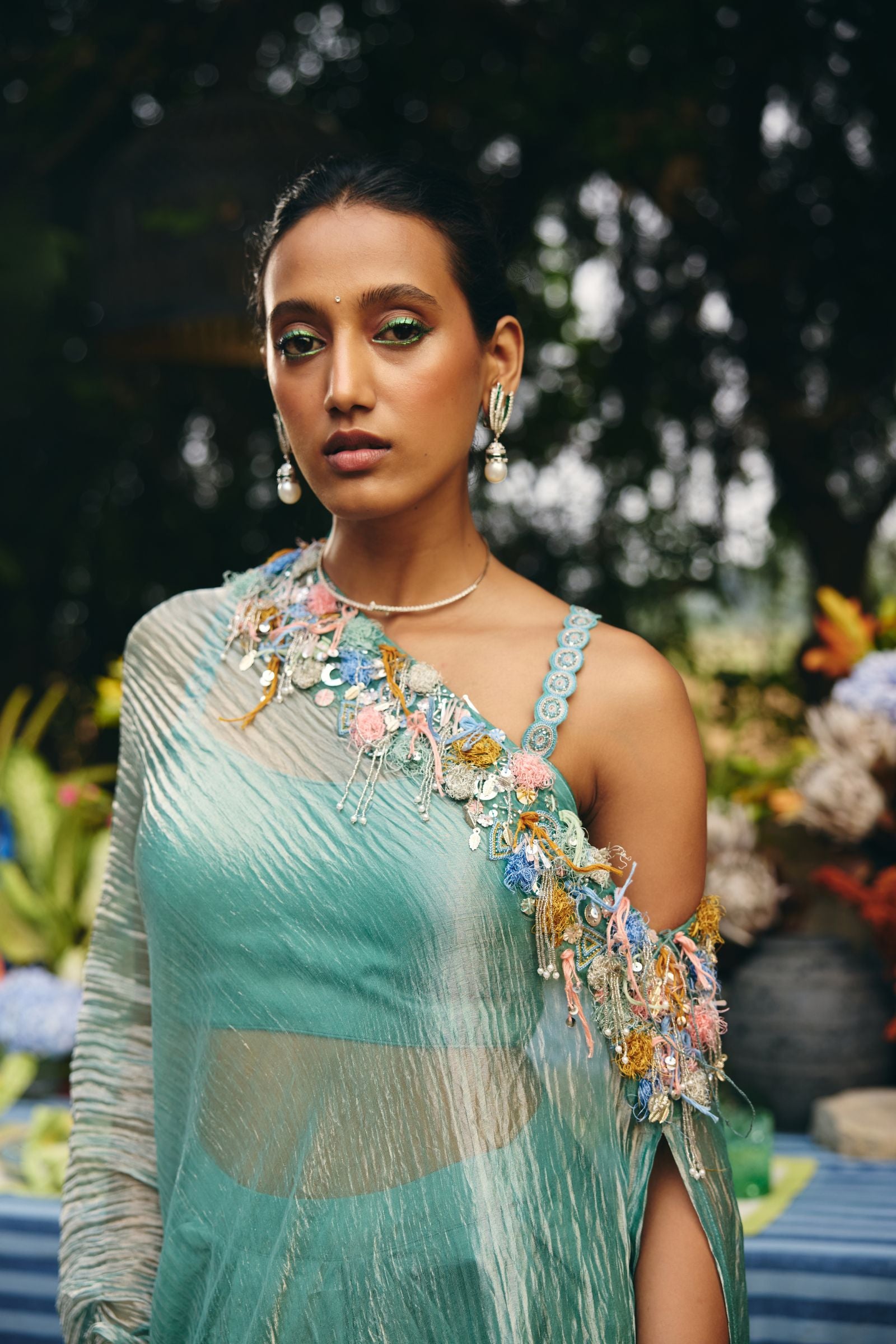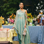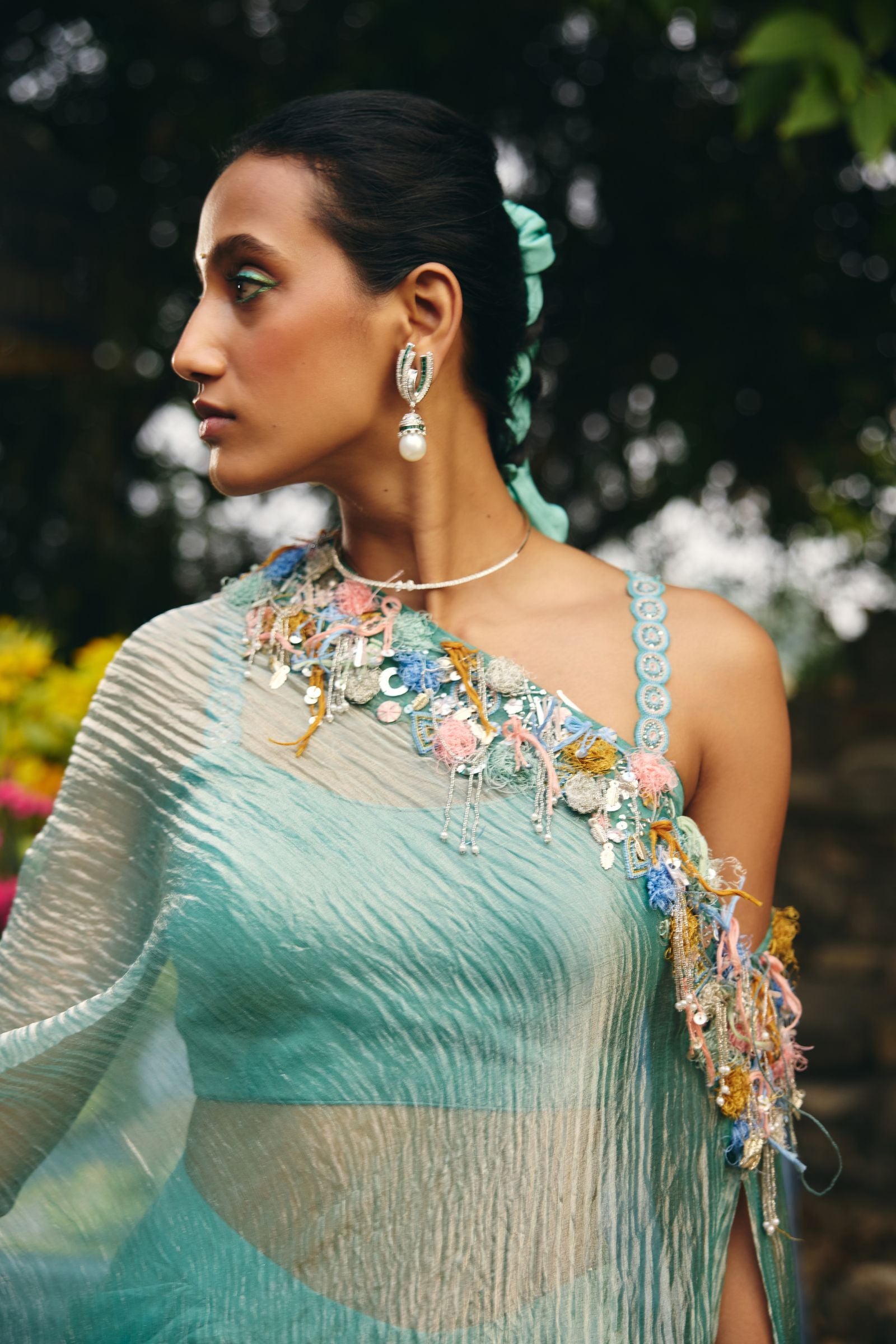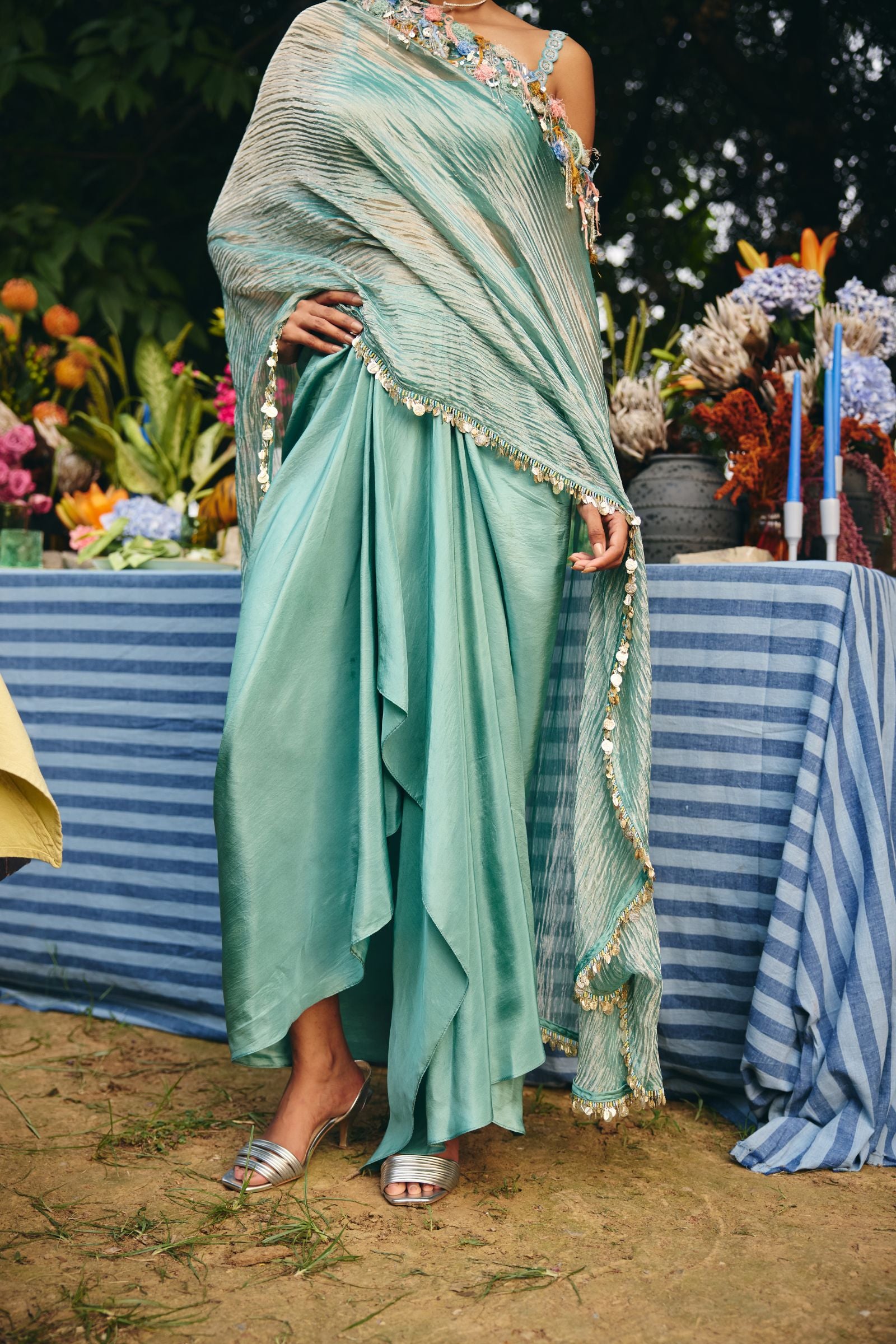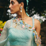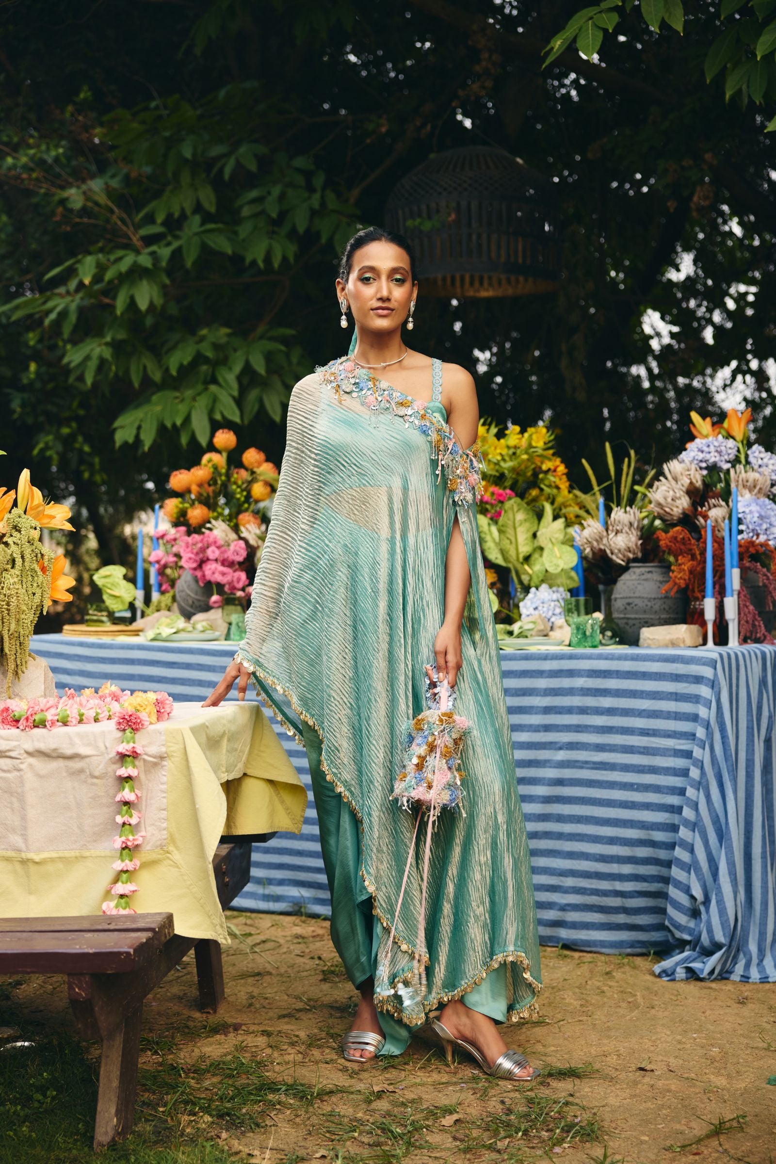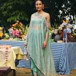 one shoulder cape embroidery enriched with silver zari ,kasb , sequence ,silk thread , with hand embroidery. Cape finished hand made lace ( mixed of metal material )paired with blouse and draped skirt