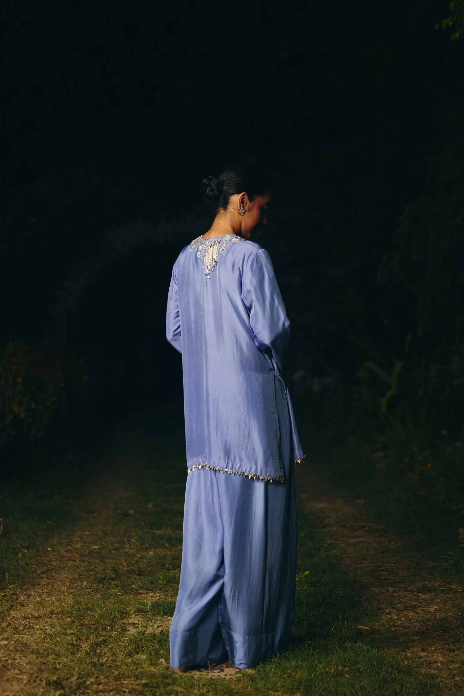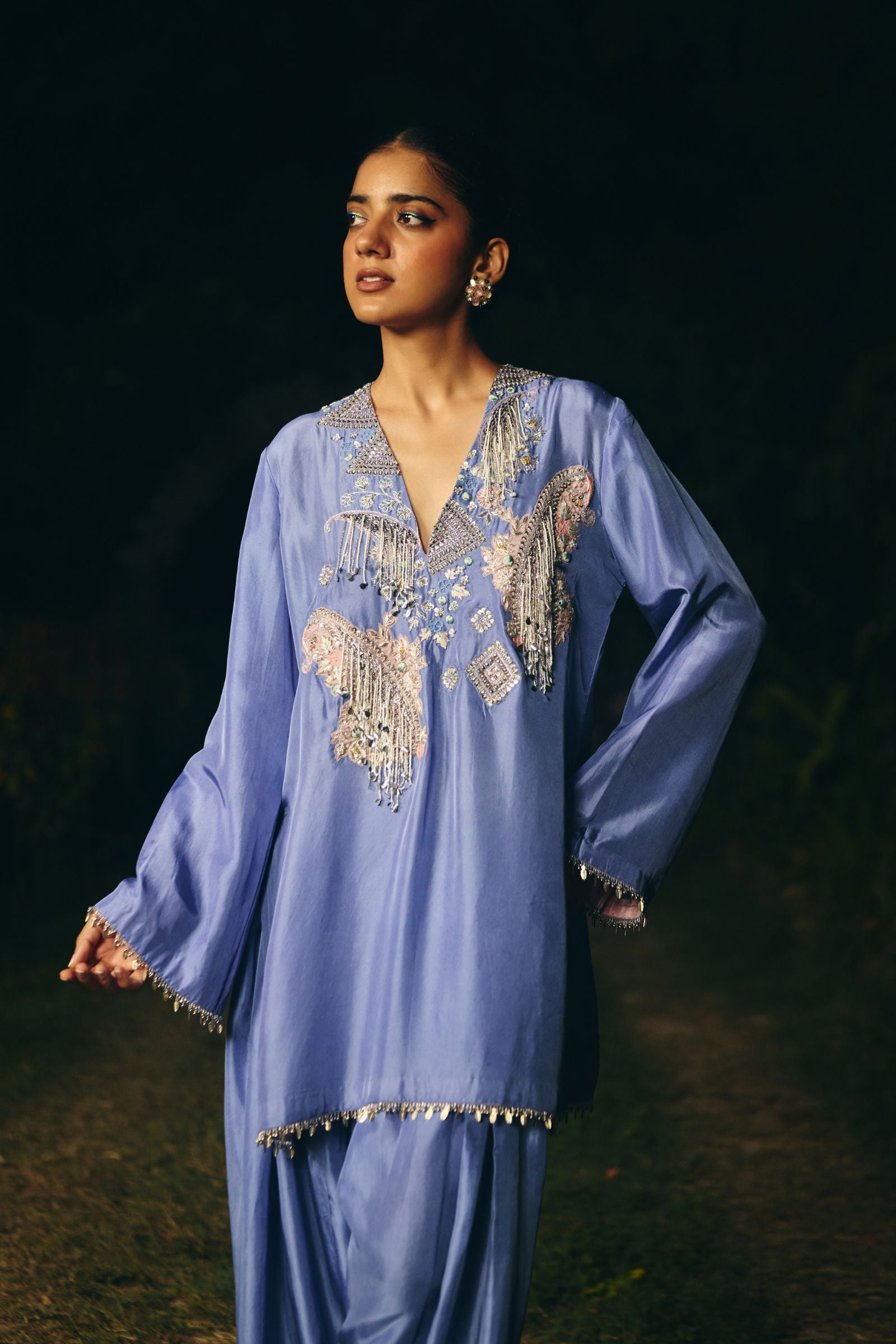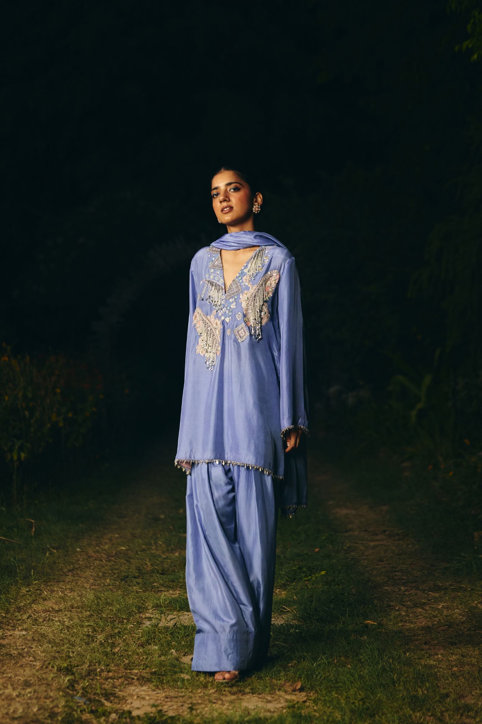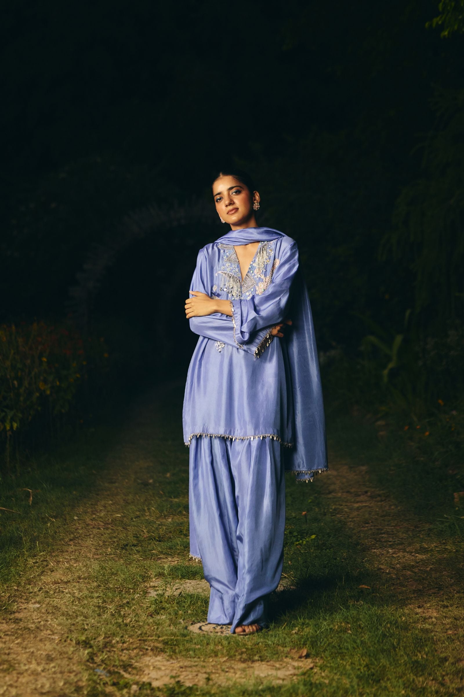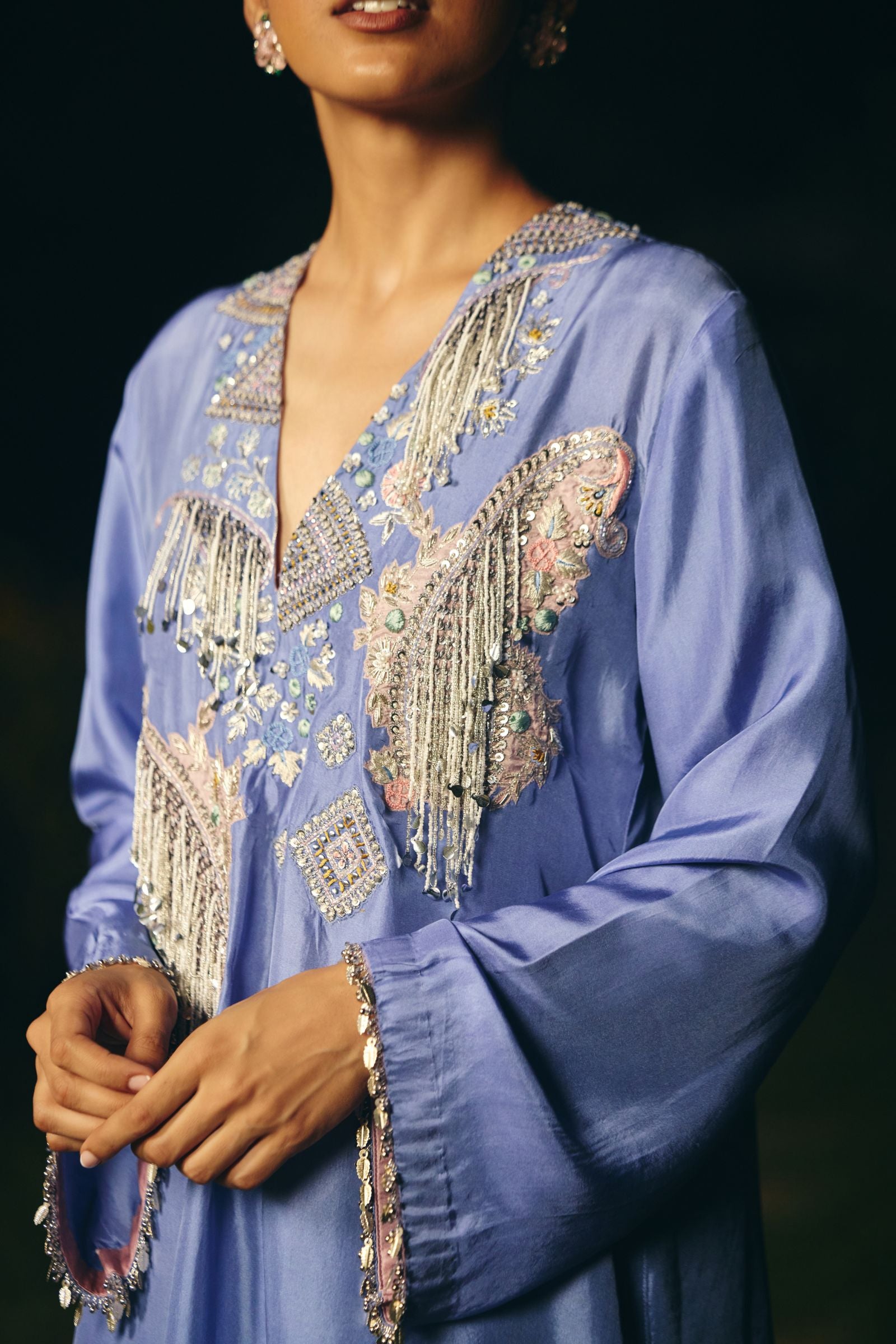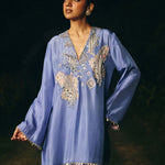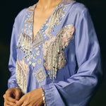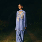 kurta embroidery enriched with silver zari ,kasb , sequence ,silk thread , silver dabka,white pearls with metal stone hand embroidery. Fkurta nad dupatta inished hand made lace ( mixed of metal material )paired with dupatta and farshi salwar