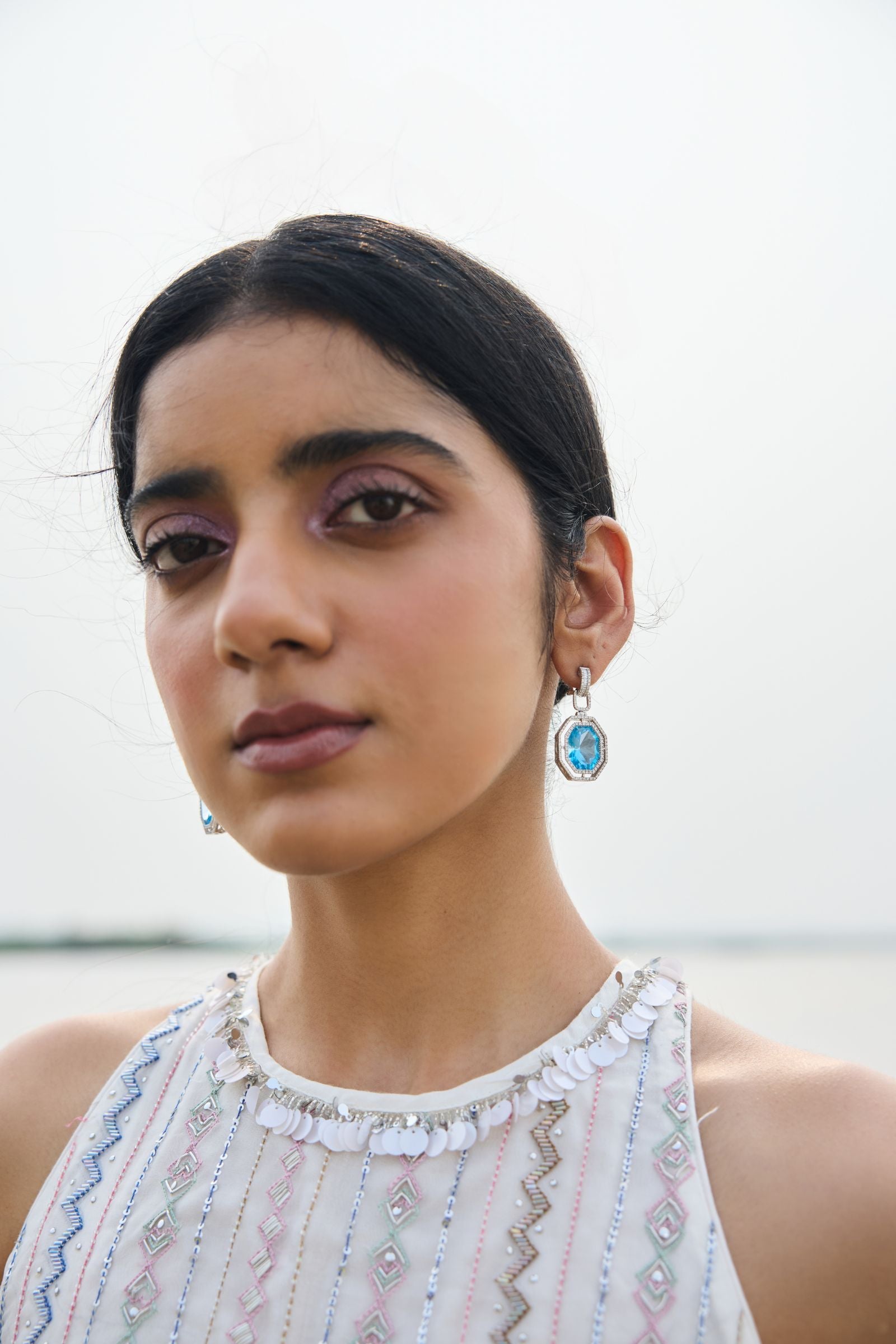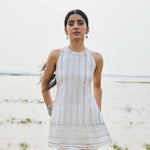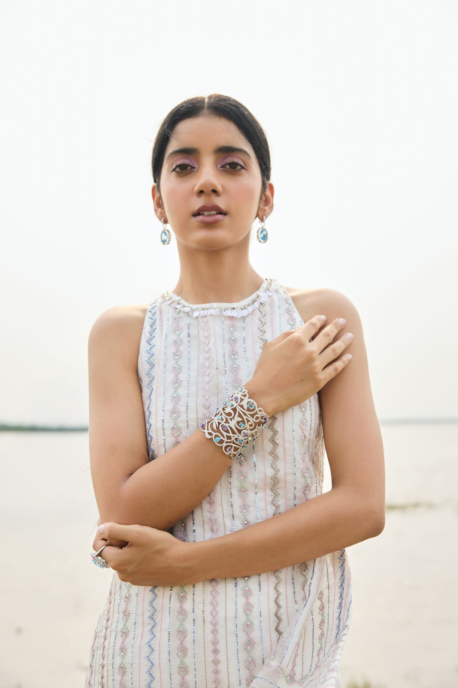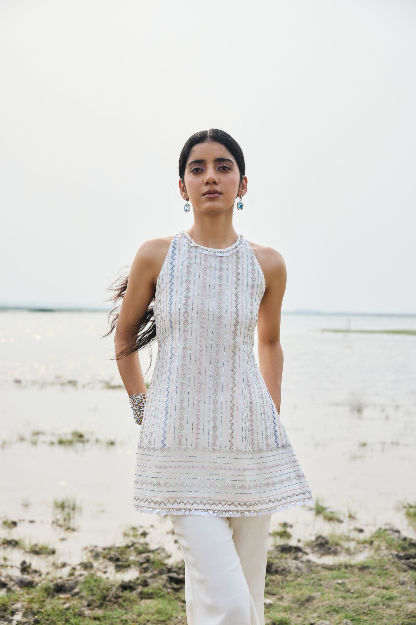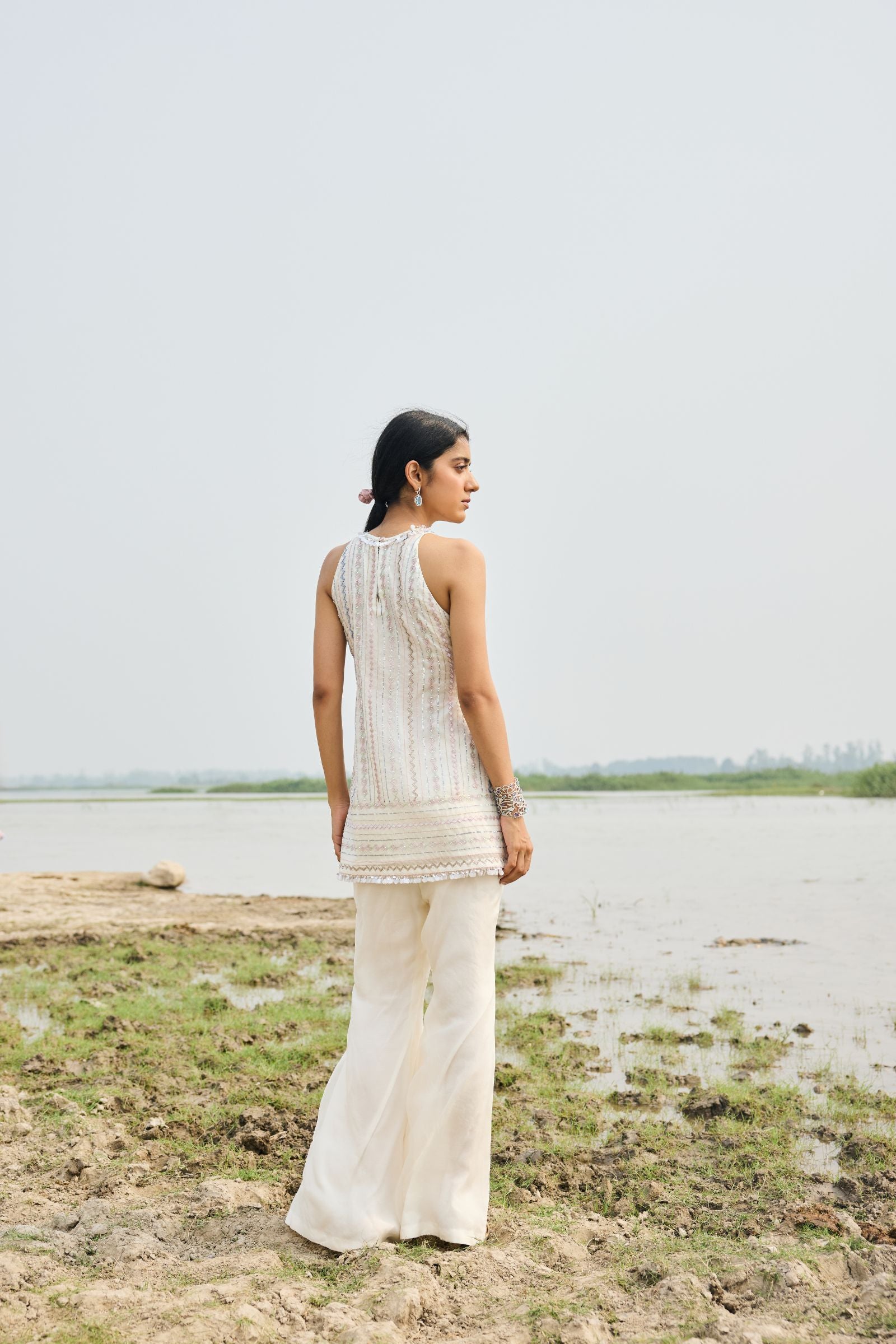 short kurta with heavy hand embroidery , enriched with cutdana, nalki , sequence silk thread and metal stone . Dupatta and kurta finish with hand made laces.paired with scarf .