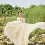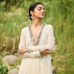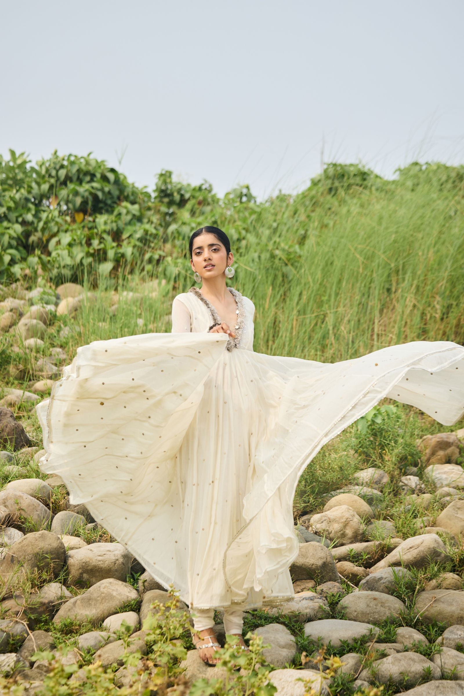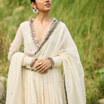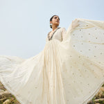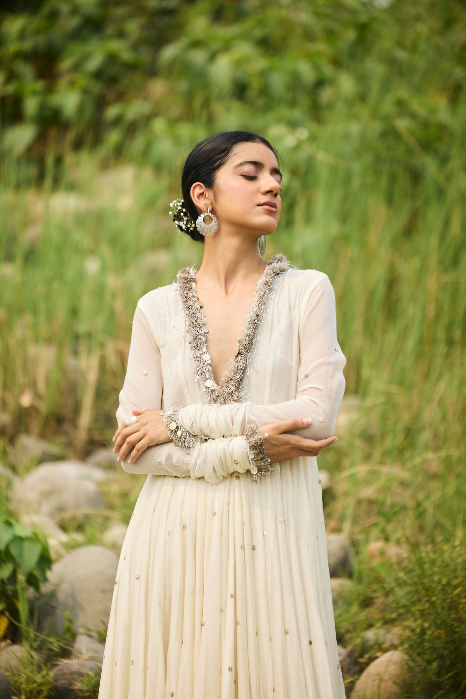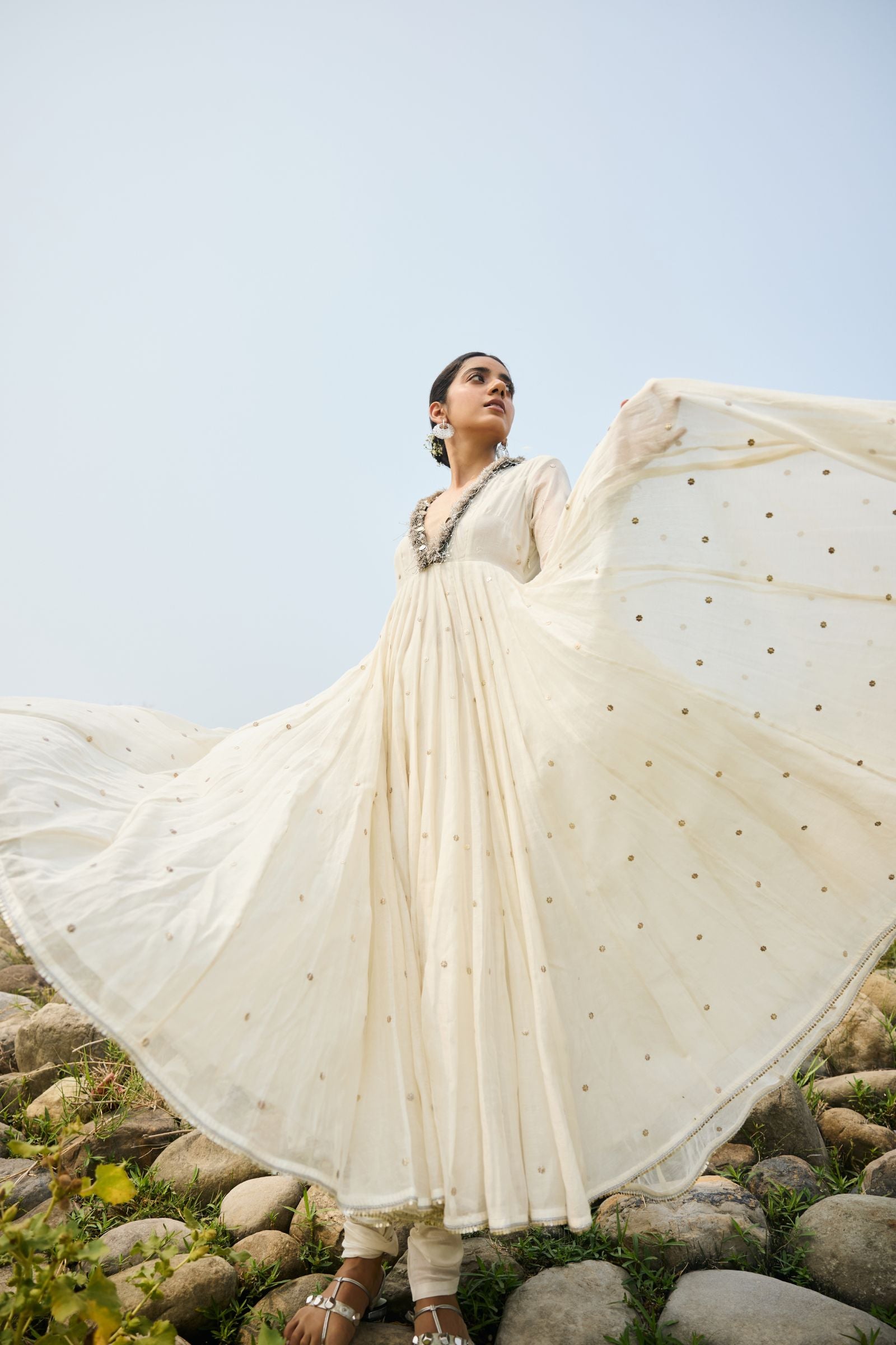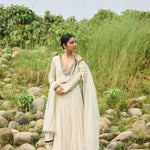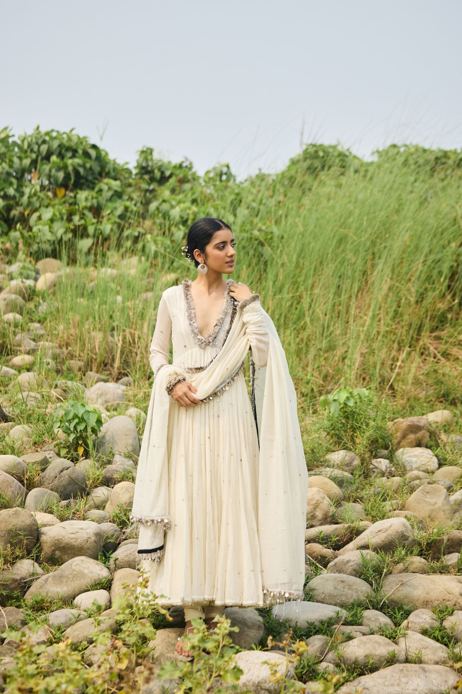 chanderi anarkali embroidery enriched with grey silver material like zari, kasb and different shape of metal .paired with chutidar and dupatta finished with hand made lace .