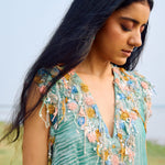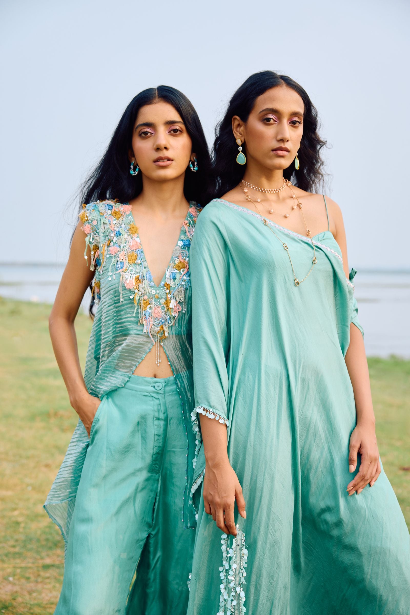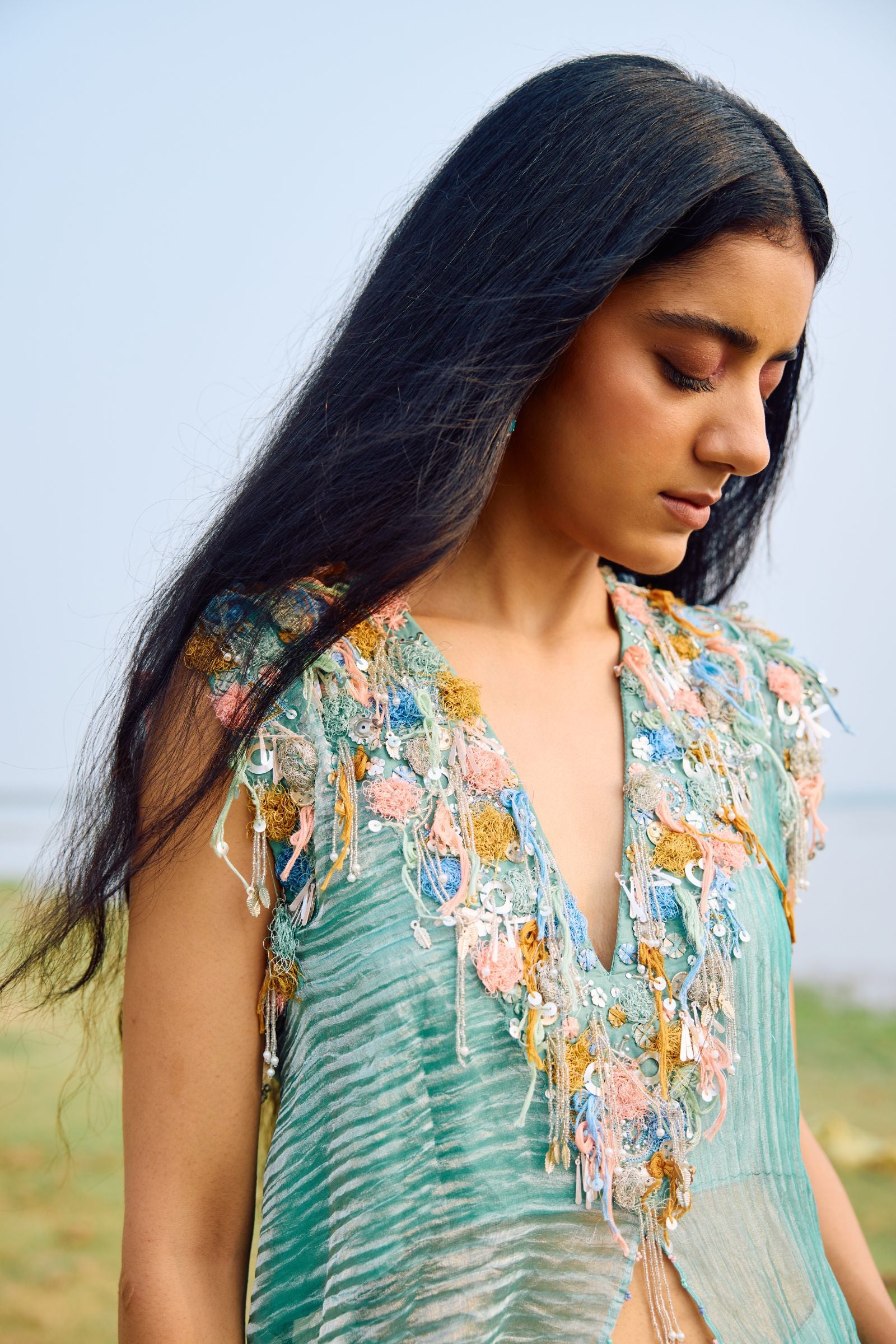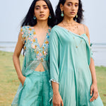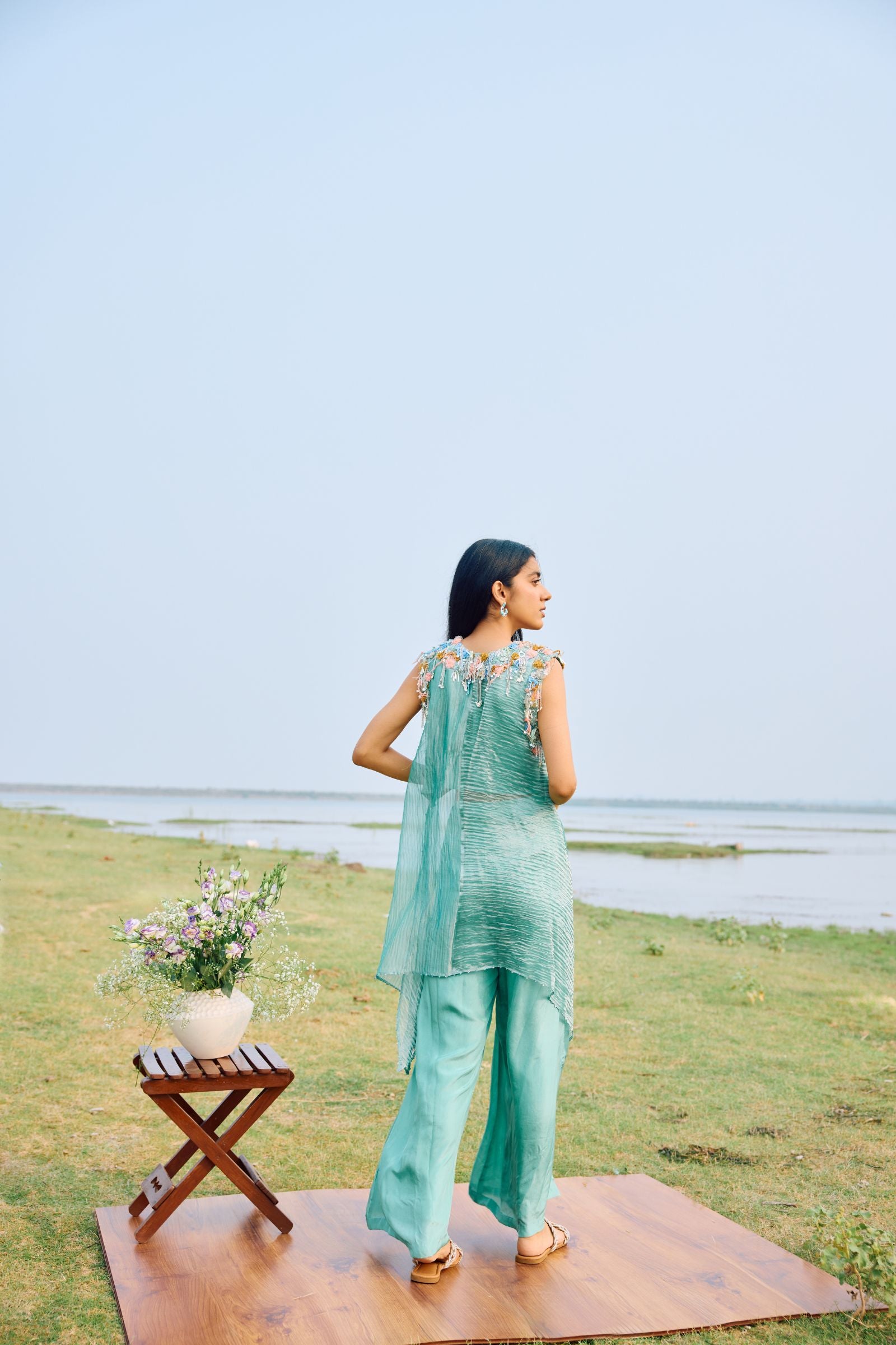 crushed tissue bias cape embroidery enriched with silver zari ,kasb , sequence ,silk thread , with hand embroidery. Cape finished multi color beads paired with box pleated pant