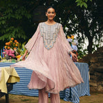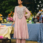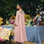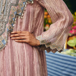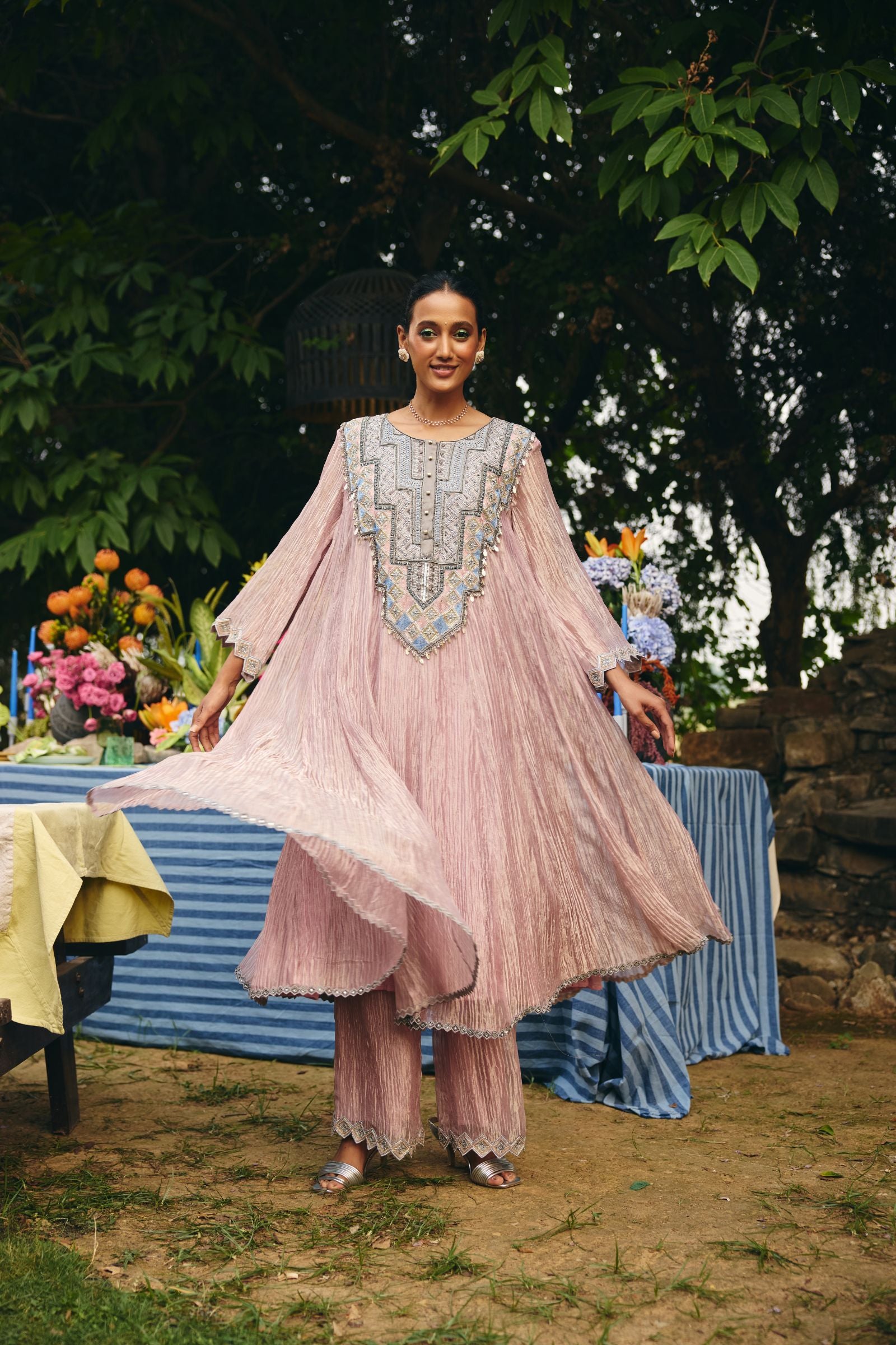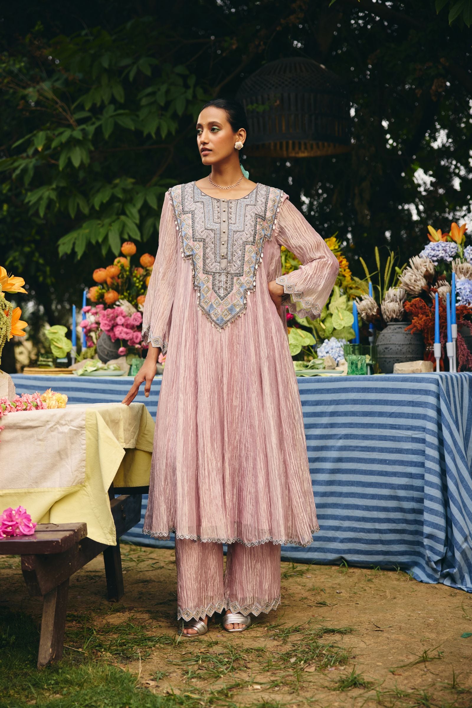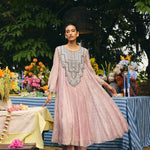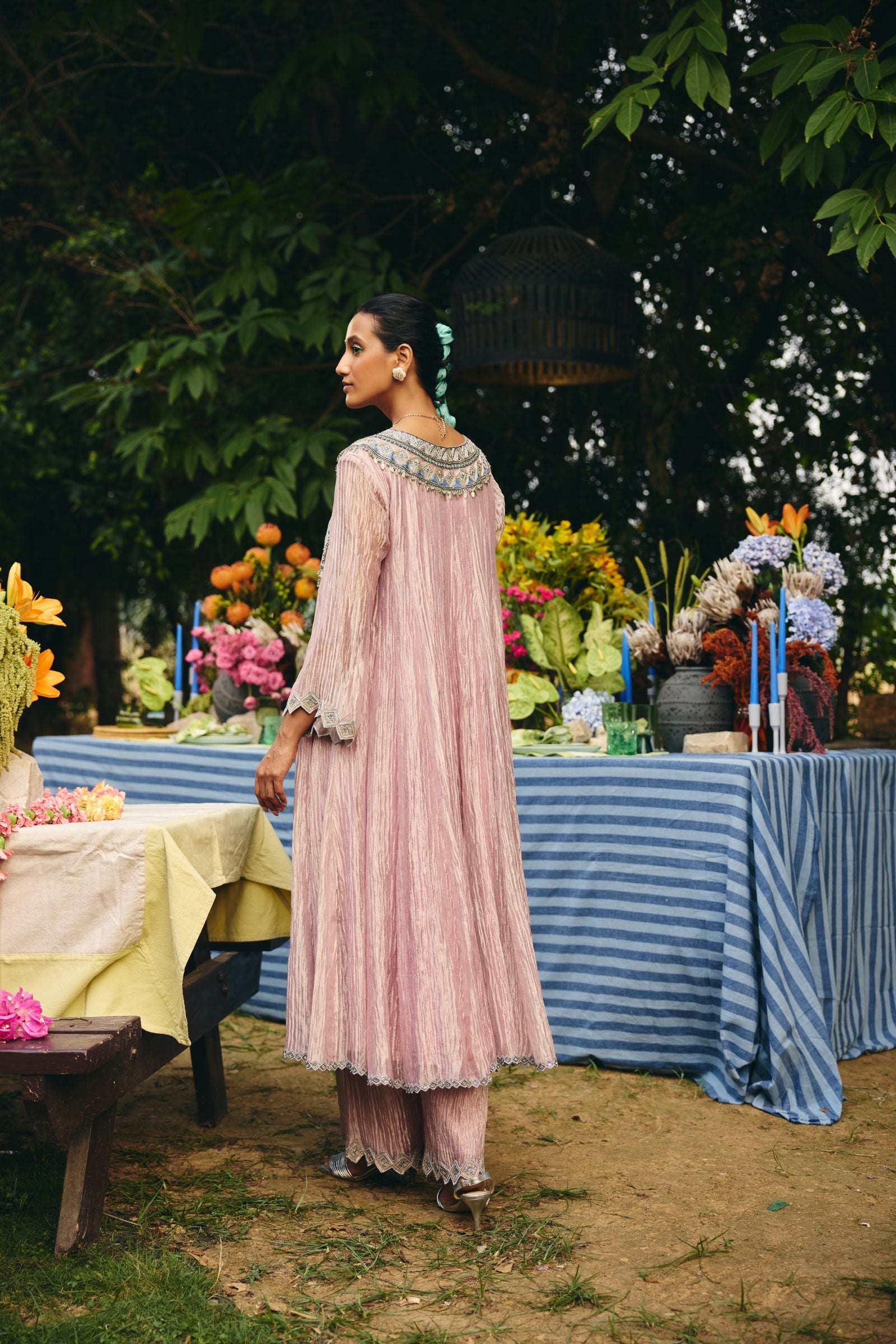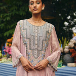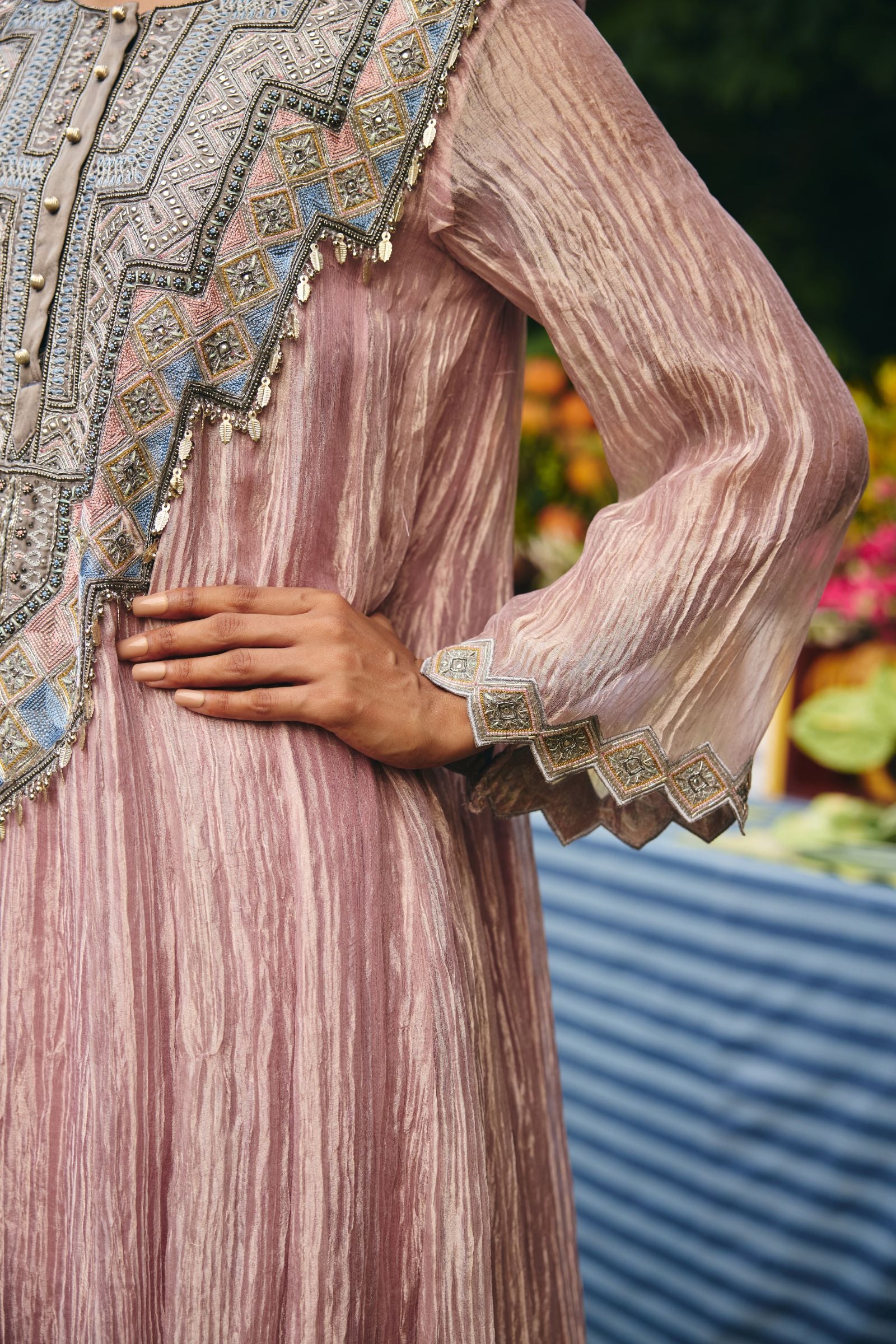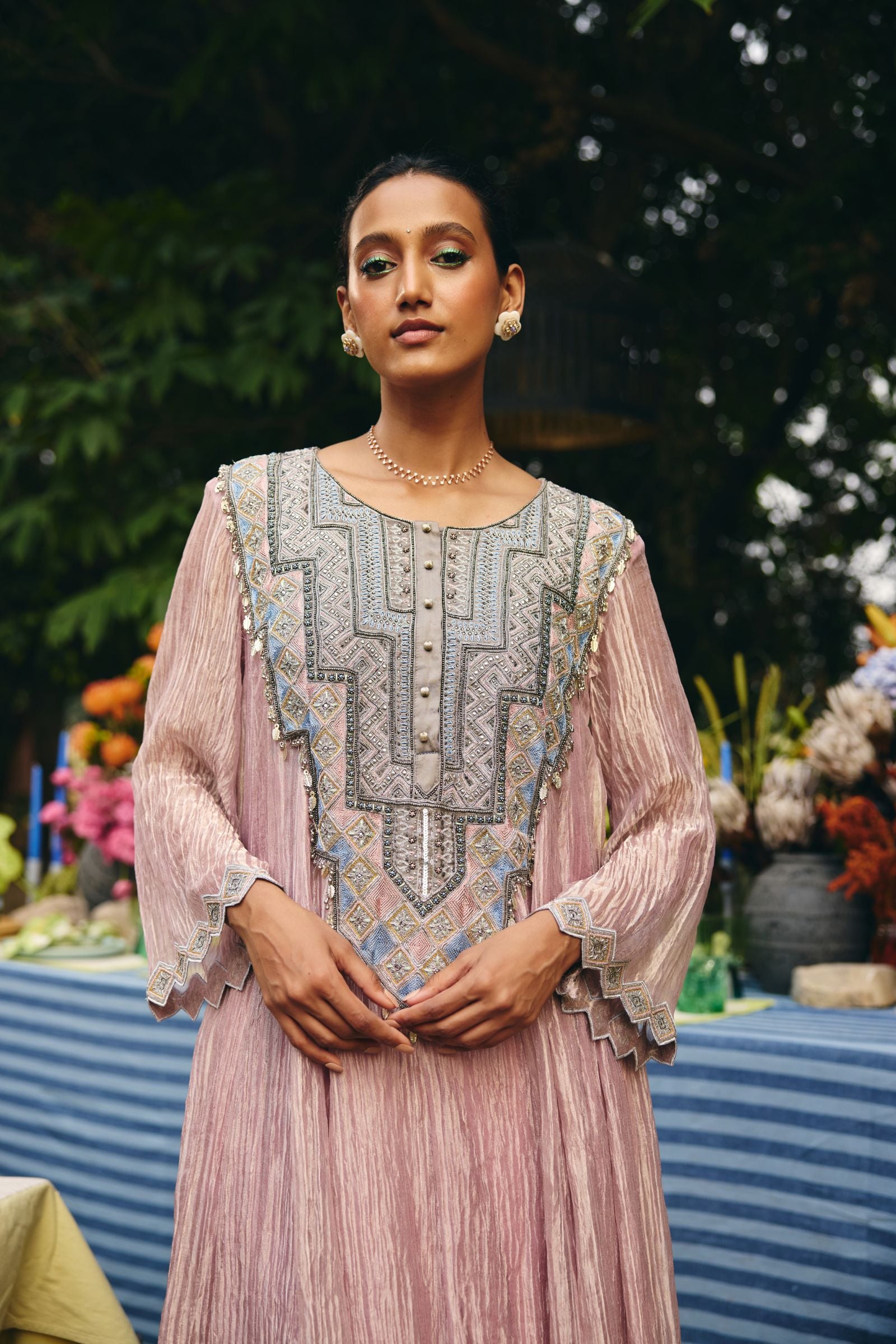 pink crushed tissue anarkali with grey heavy embroidered yoke , sleeve border,anarkali border and pant border . Yoke finished handmade lace .silver grey embroidery enriched with colorfull silk thread silver grey material like zari, kasb and metal stone .
