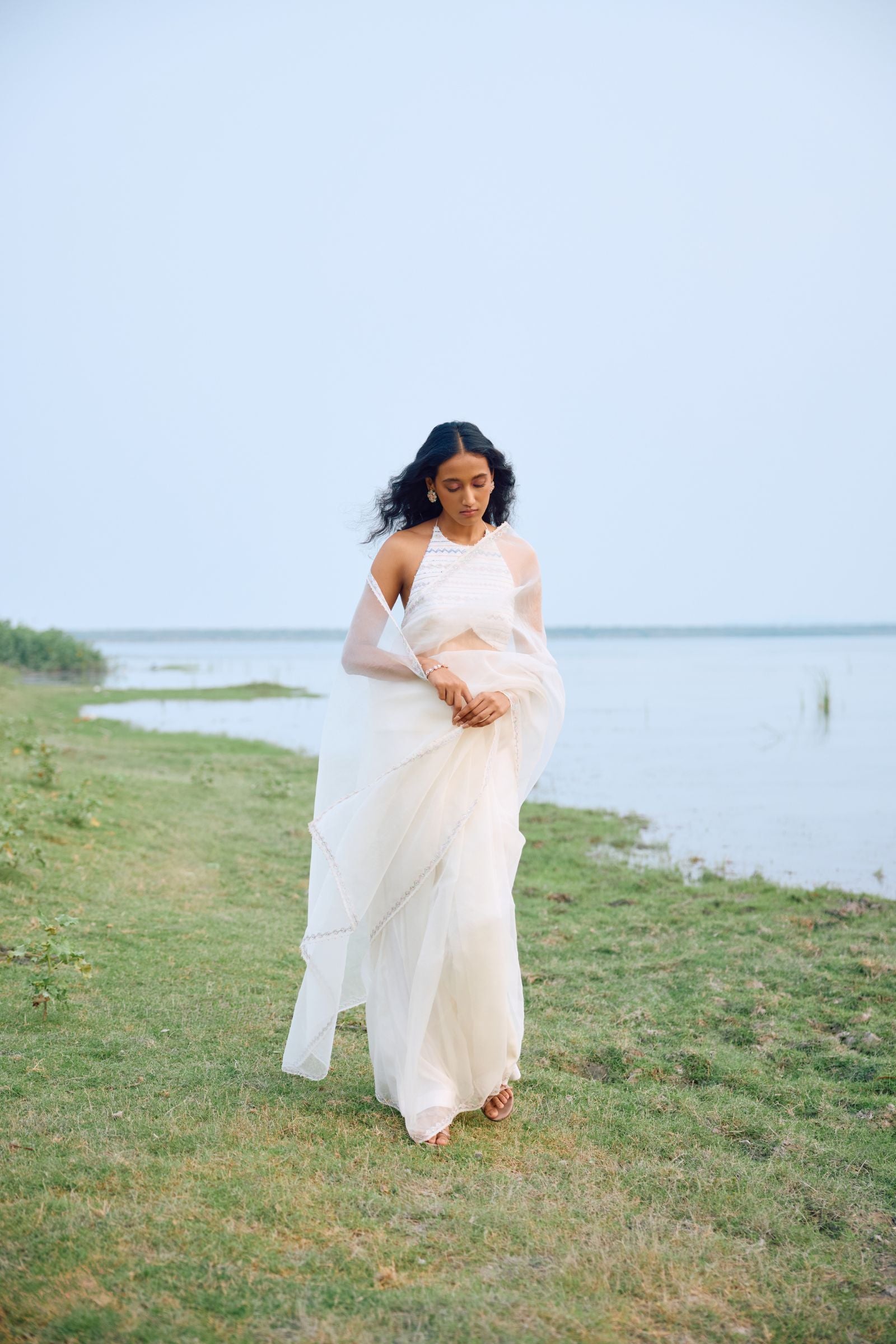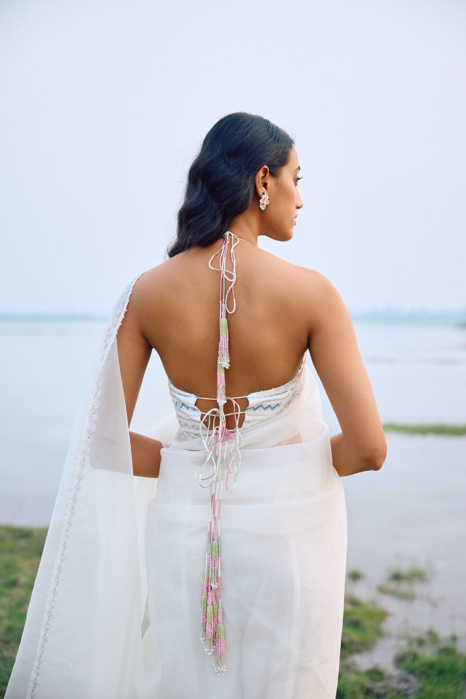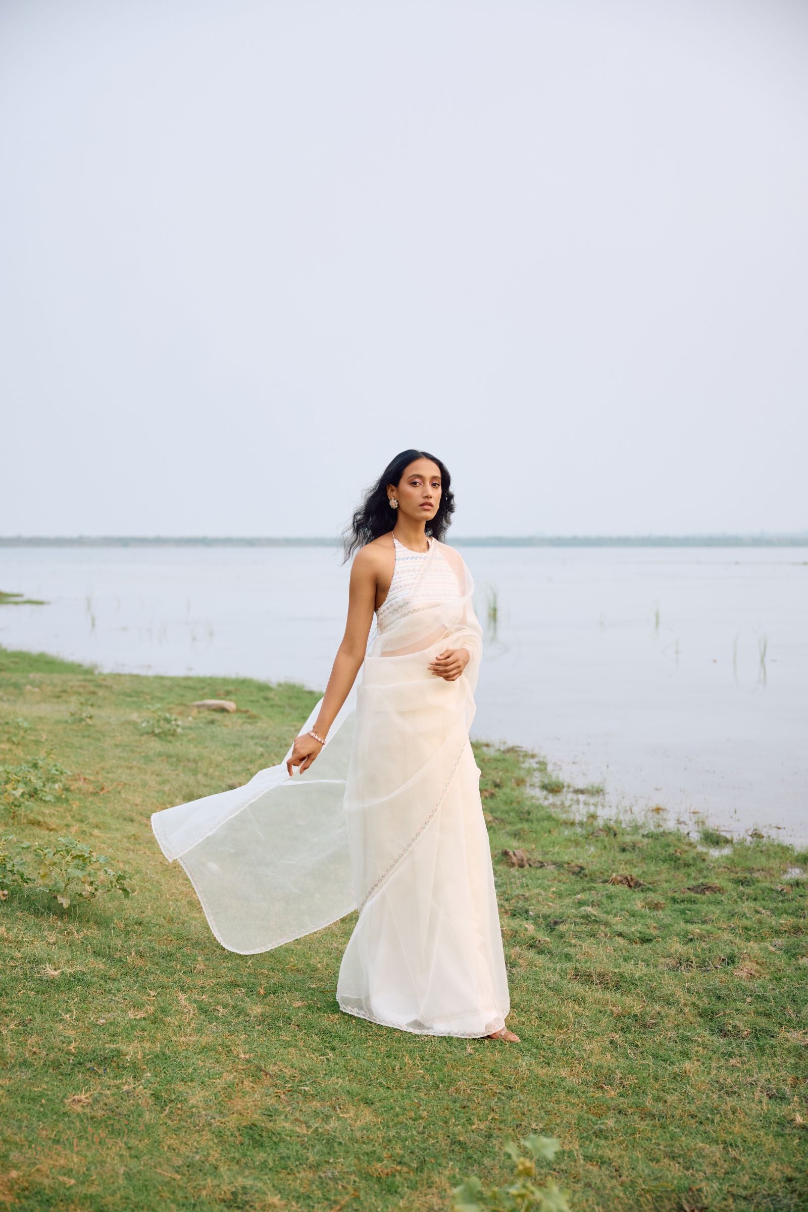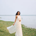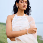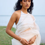 off white organza saree with sleek border paired with heavy hand embroidered blouse enriched with cutdana, nalki , sequence silk thread and metal stone . Dupatta and kurta finish with hand made laces.paired with peticoat