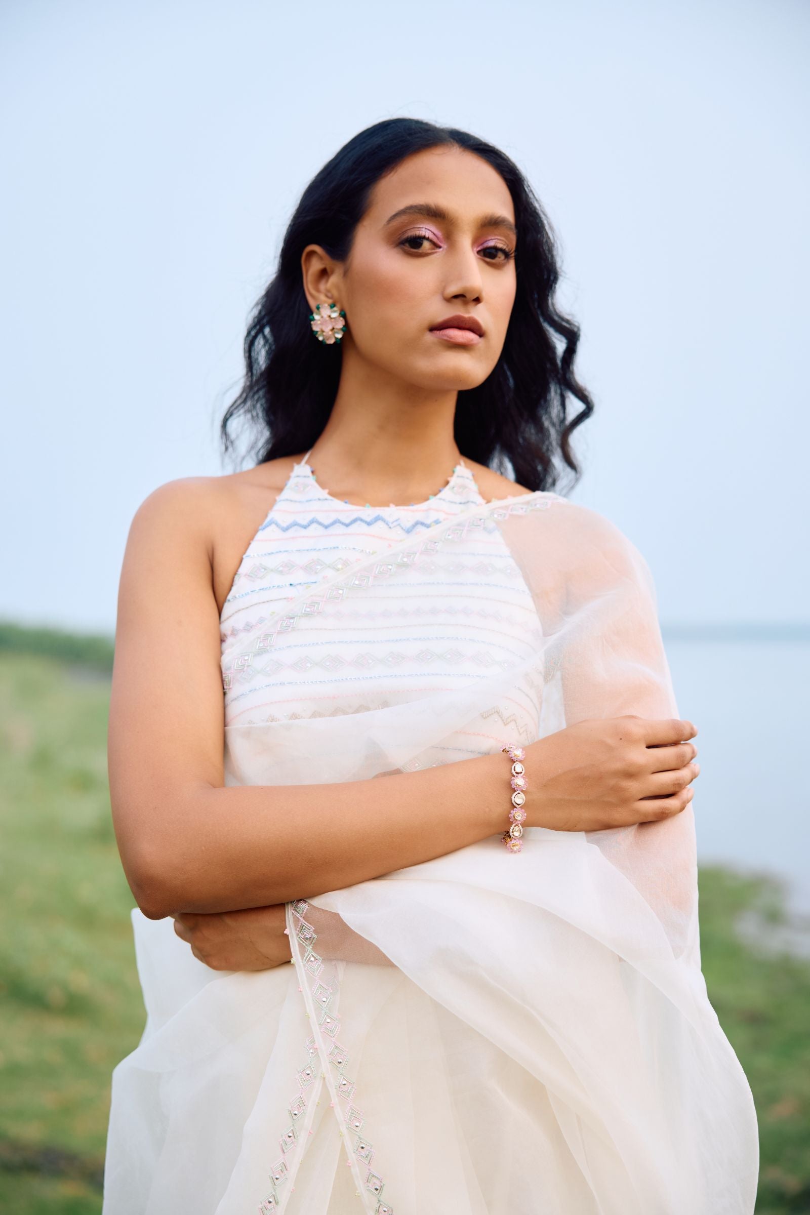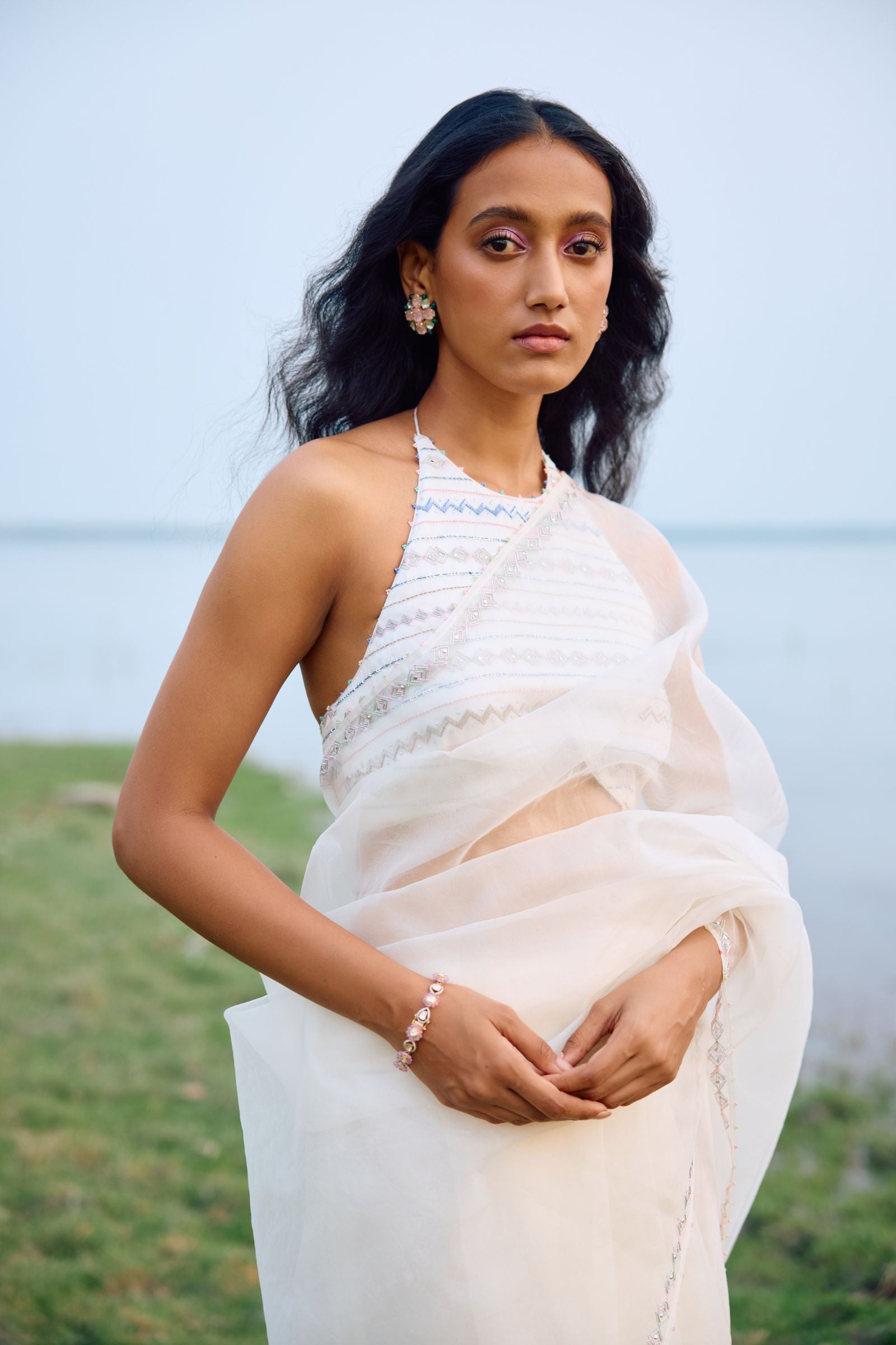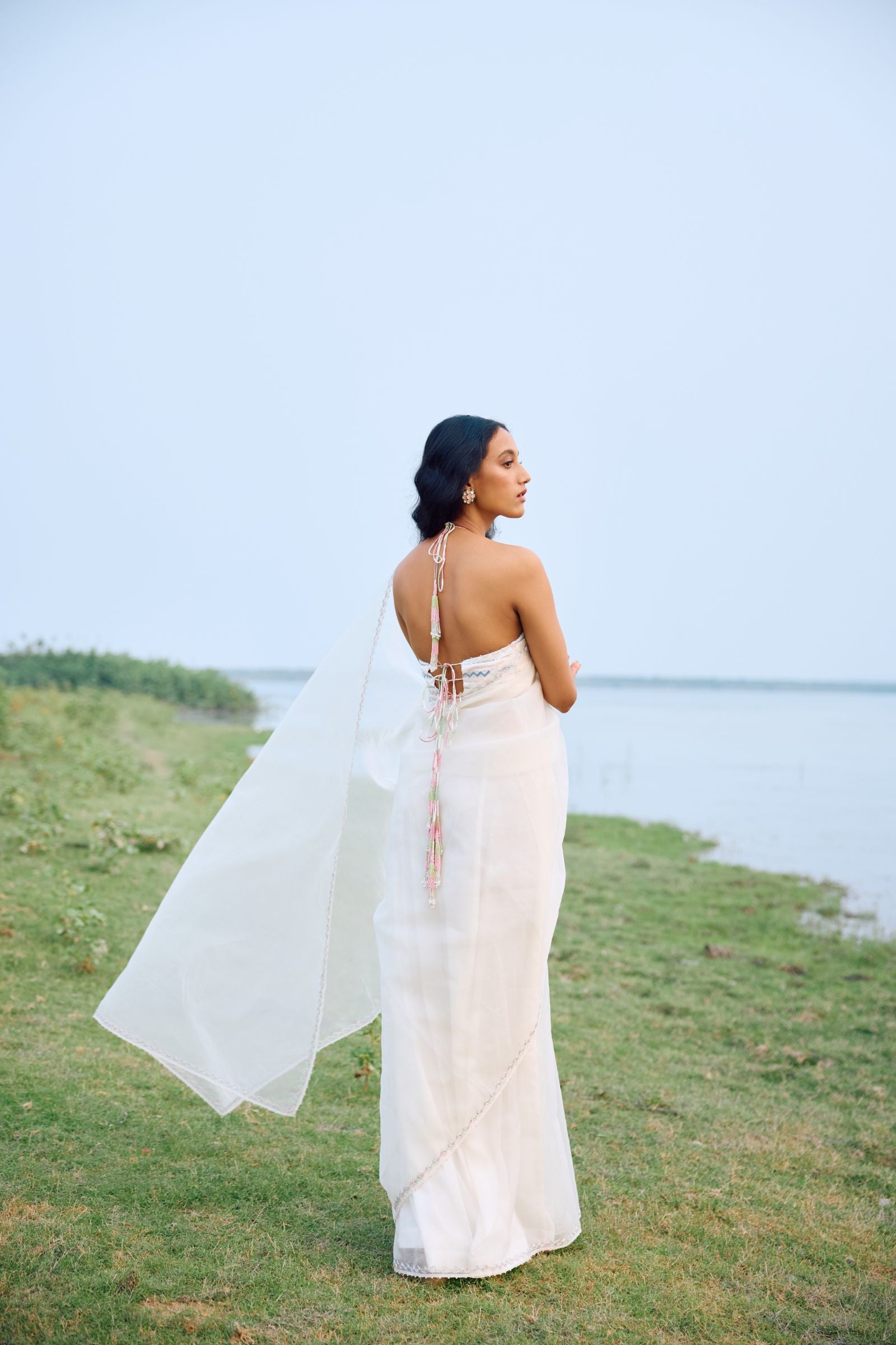 off white organza saree with sleek border paired with heavy hand embroidered blouse enriched with cutdana, nalki , sequence silk thread and metal stone . Dupatta and kurta finish with hand made laces.paired with peticoat