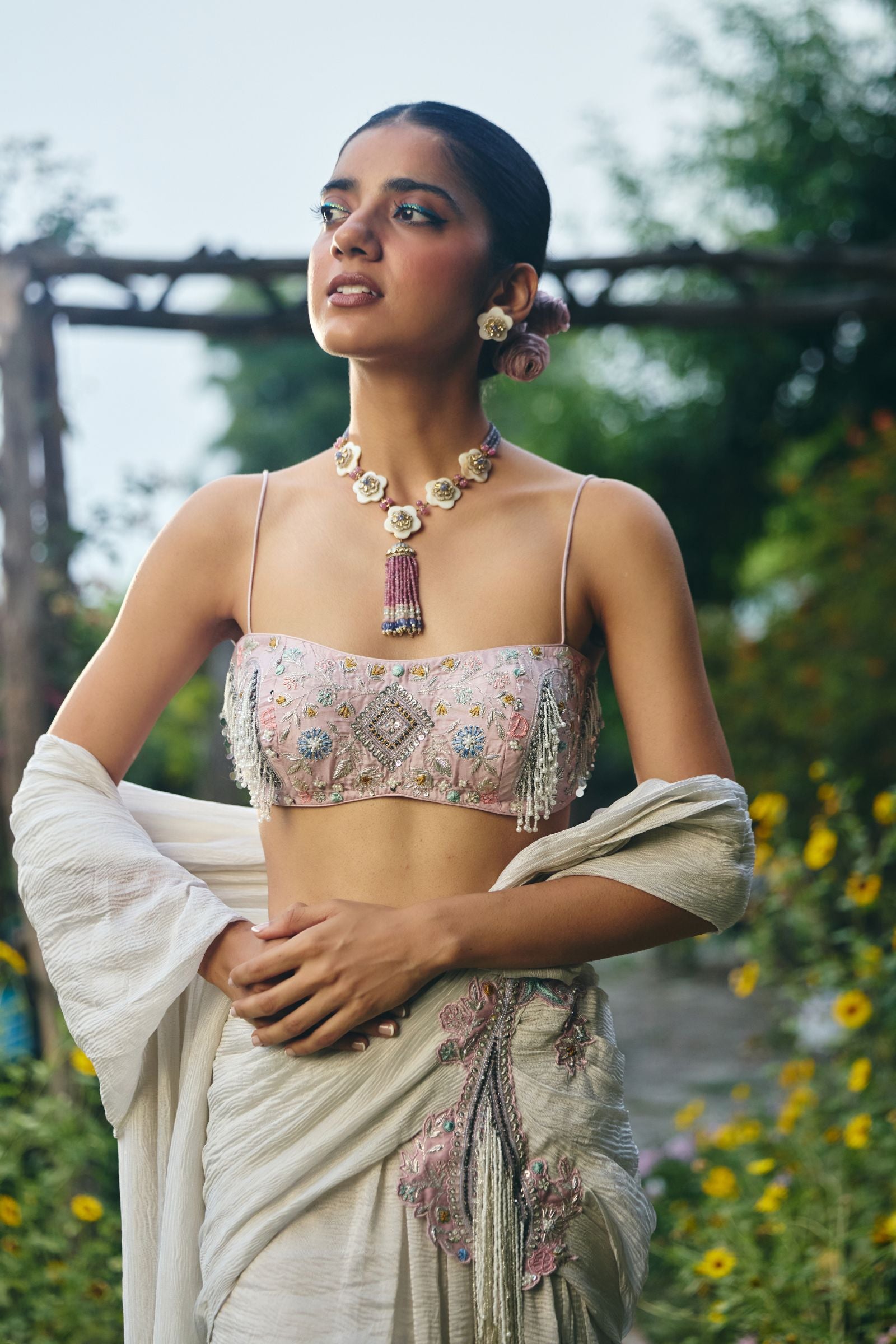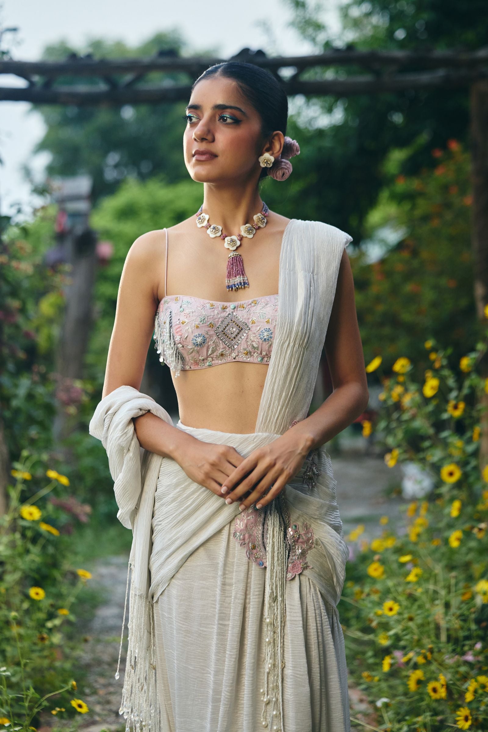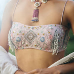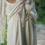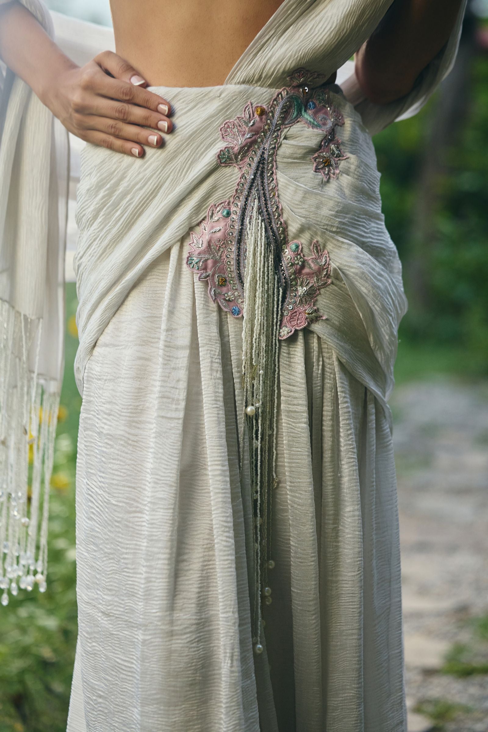drape silver saree with patch work on waist with lots of log dangle paired with full embroidered blouse enriched with silver zari ,kasb , sequence ,silk thread , silver dabka with lots of dangles hand embroidery. Finished with lonhand done dangleand tessel.