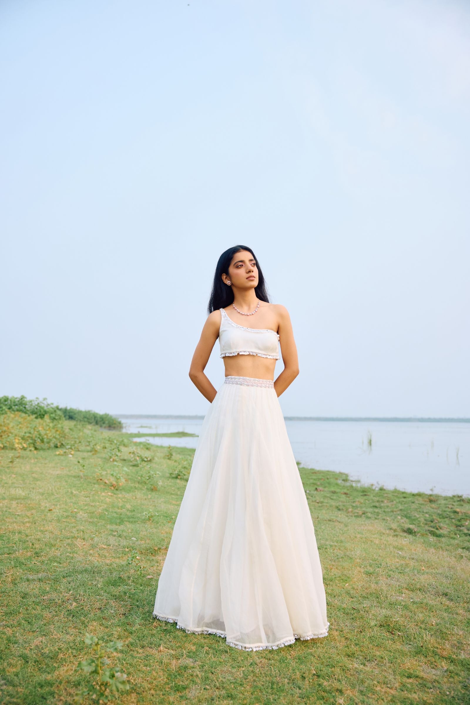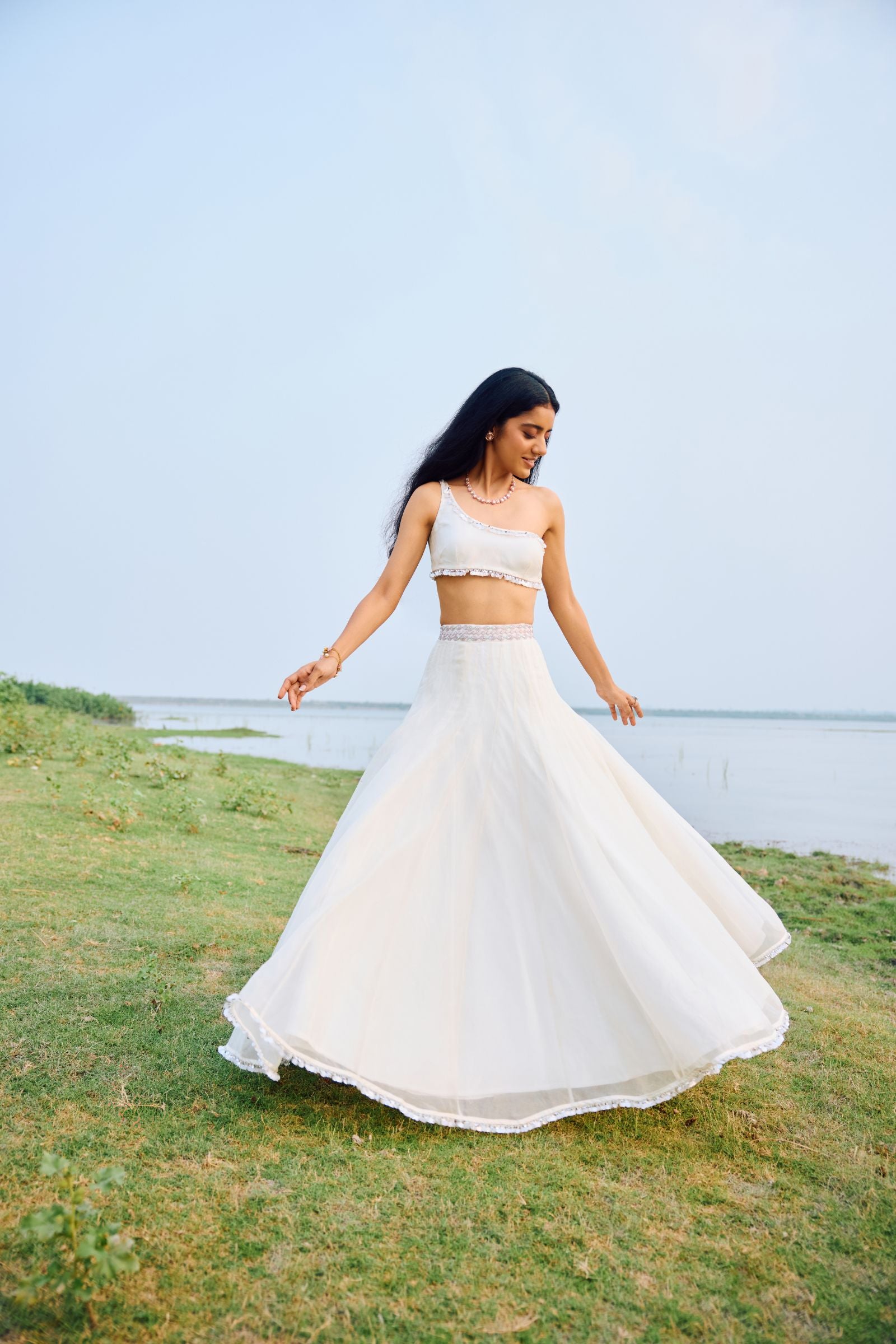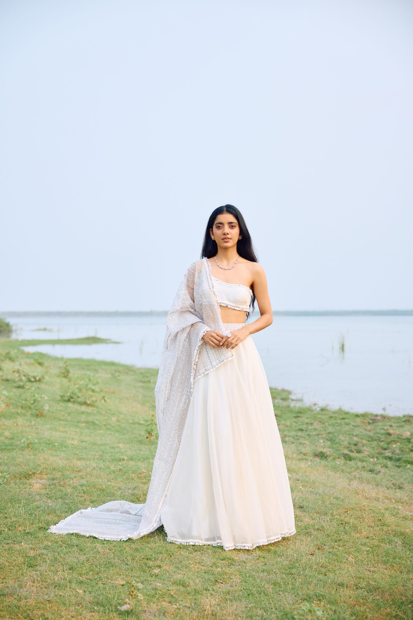 off white organza lehenga with embroidery on waist ,blouse and ghera finished with sequence lace .dupatta is full of zaal embroidery enriched with cutdana , silk thread and sequence are used in embridery . Dupatta is full of embriodered geometrical shape .finish with hand made lace and tessel .