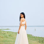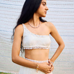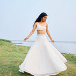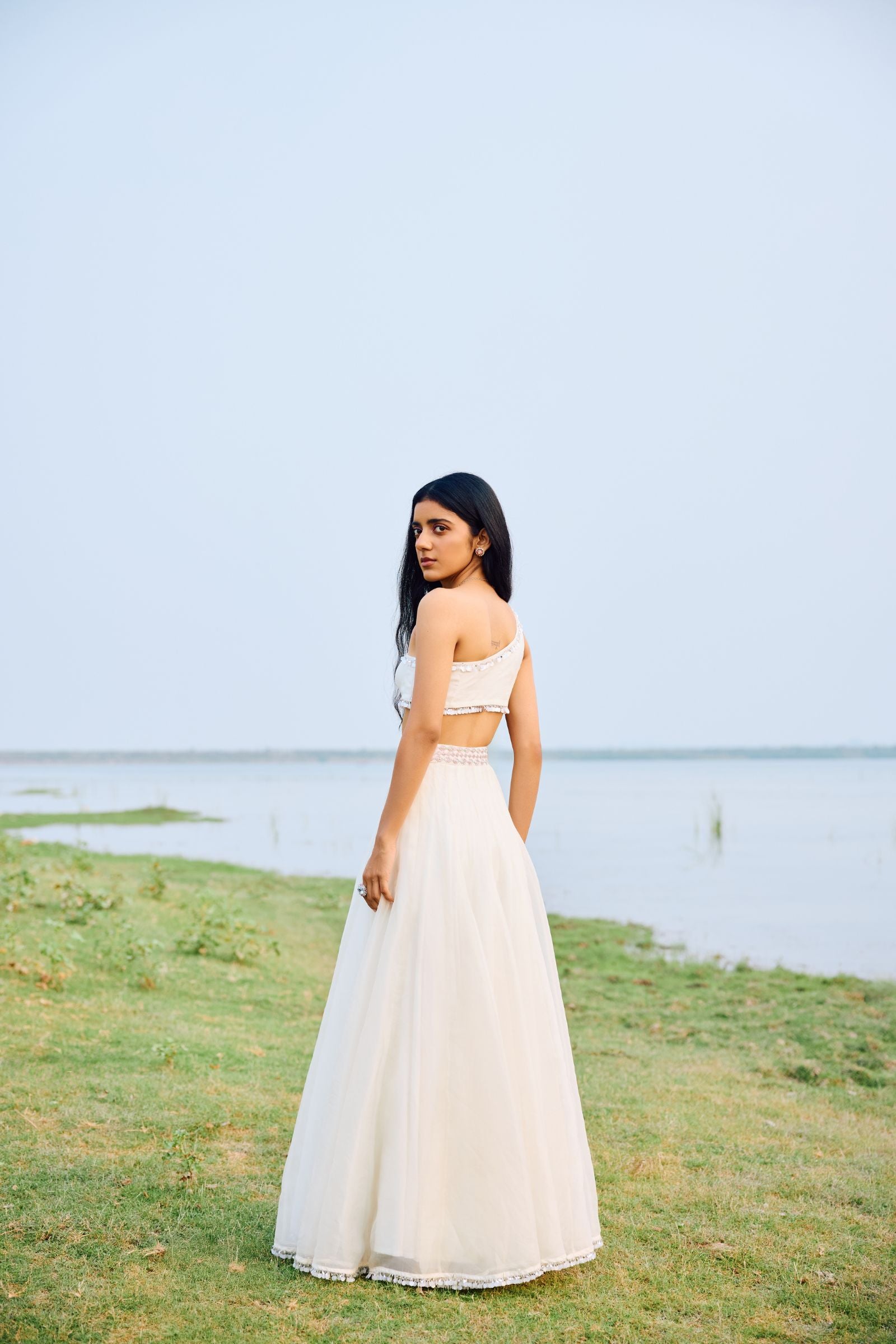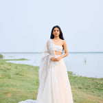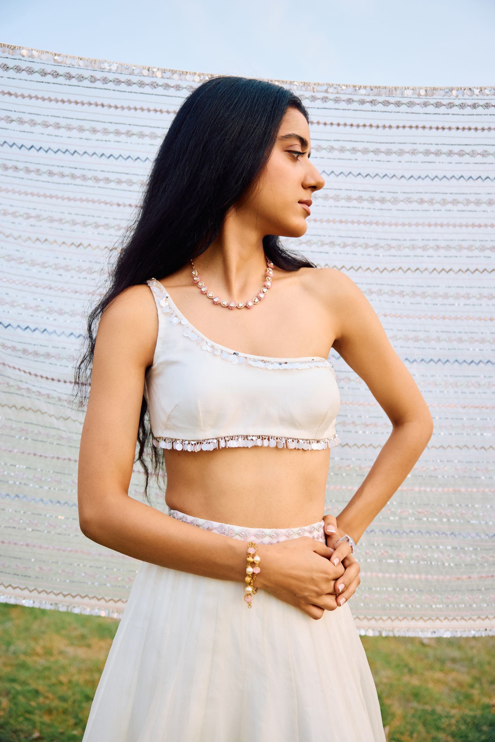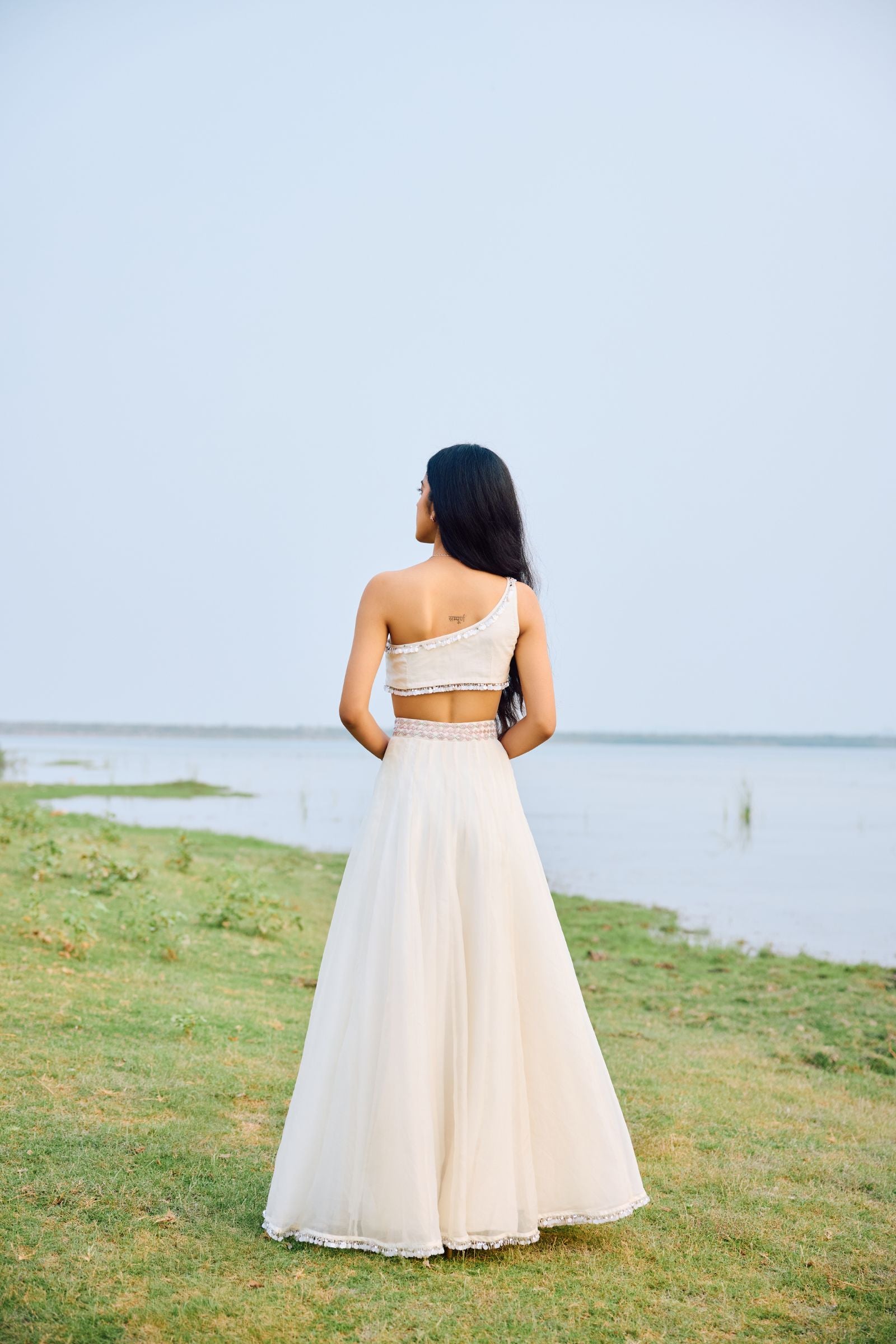 off white organza lehenga with embroidery on waist ,blouse and ghera finished with sequence lace .dupatta is full of zaal embroidery enriched with cutdana , silk thread and sequence are used in embridery . Dupatta is full of embriodered geometrical shape .finish with hand made lace and tessel .