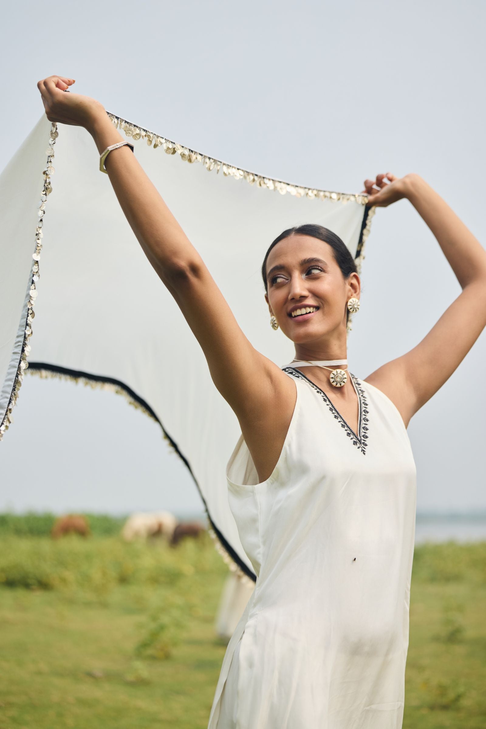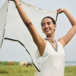 Elegant gharara set on taby silk enriched with cutdana and silk thread finish with hand made lace ( mixed metal coins and petals) and black facing .