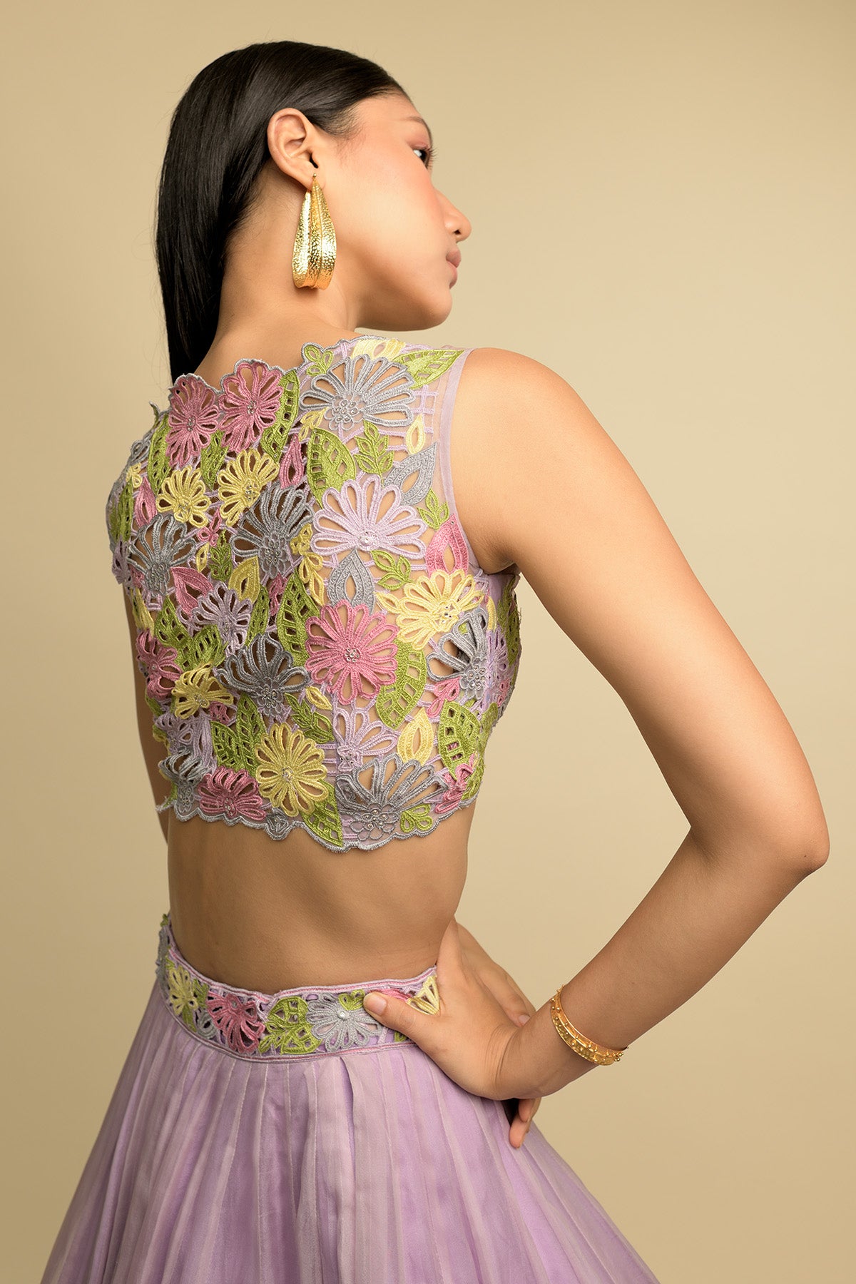 Mauve Organza Lehenga With Multicoloured Embroidery Emboldened By Hydreangea Flowers Hand Cut And Highlighted With Swarovski Crystals With Cancan, Blouse With Multicoloured Embroidered Flowers With Swarovski Crystal Highlights And Organza Dupatta