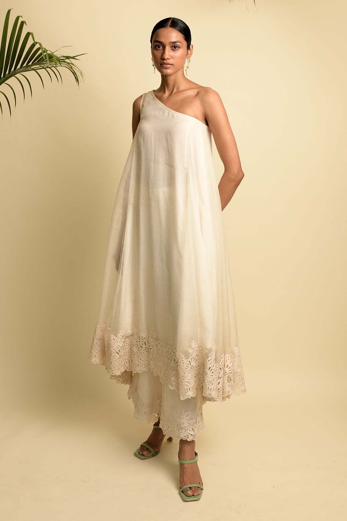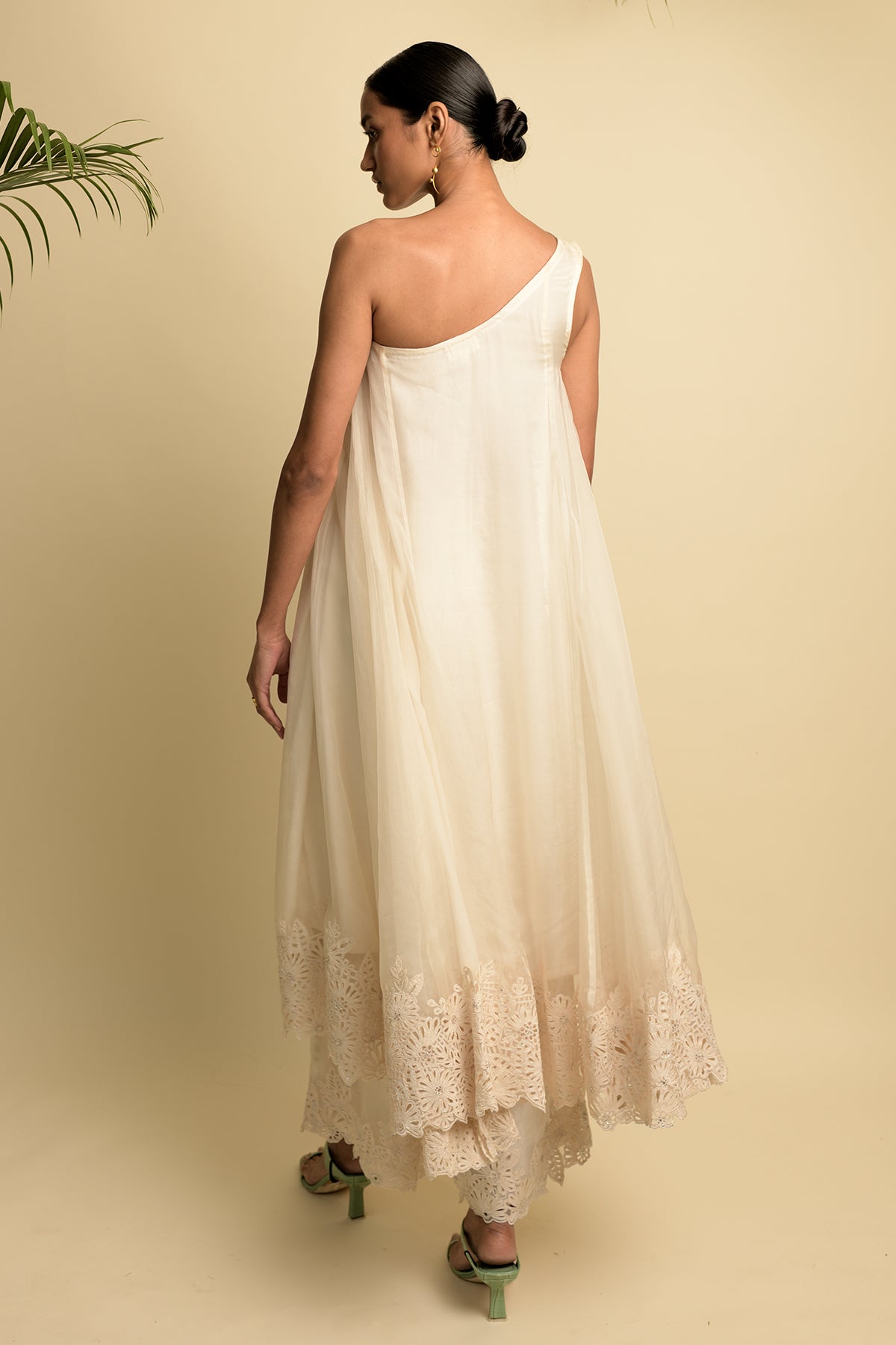 Off shouldered anarkali with embroidery inspired by monstera flowers that is hand cut and highlighted with swarovski crystals and organza palazzos