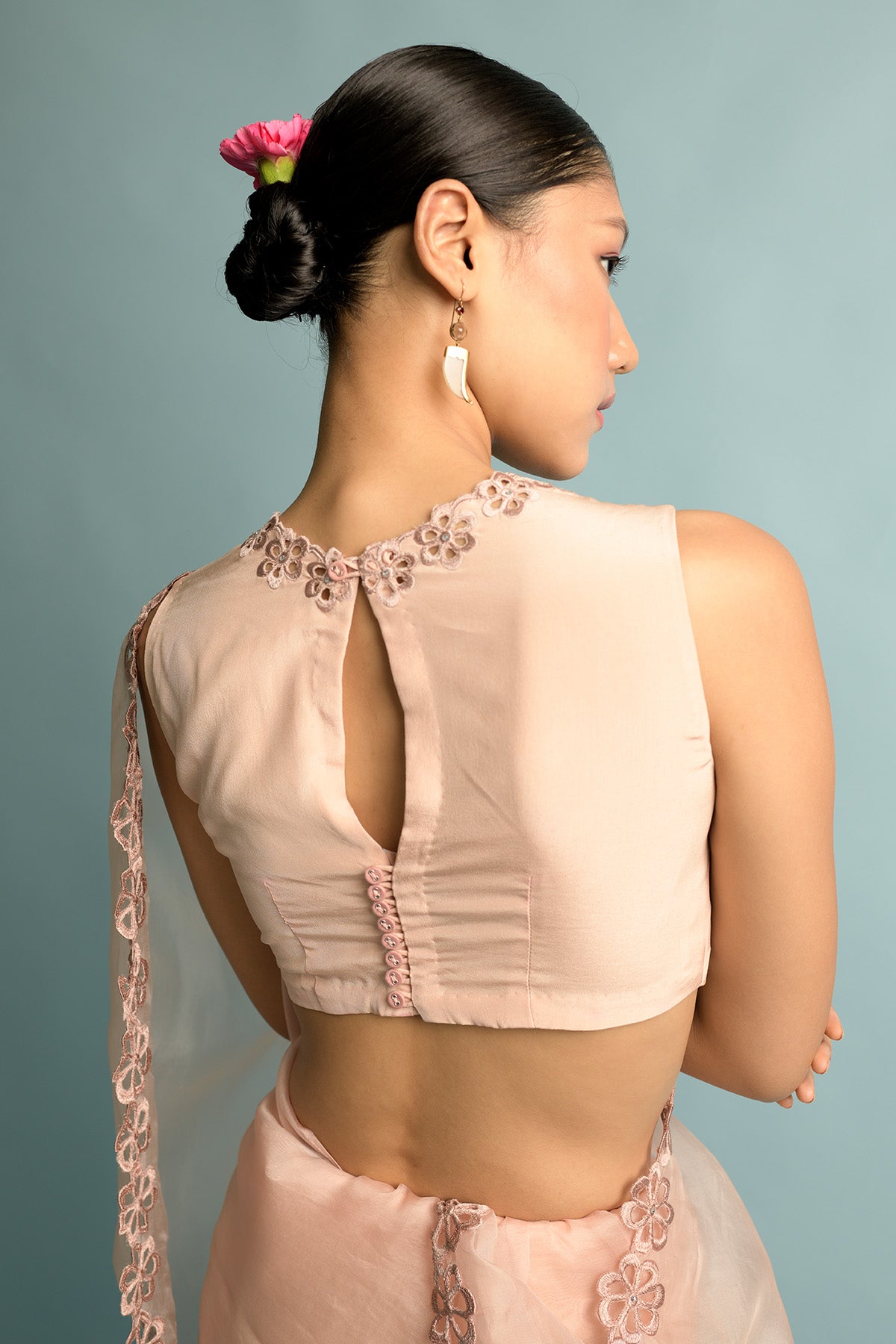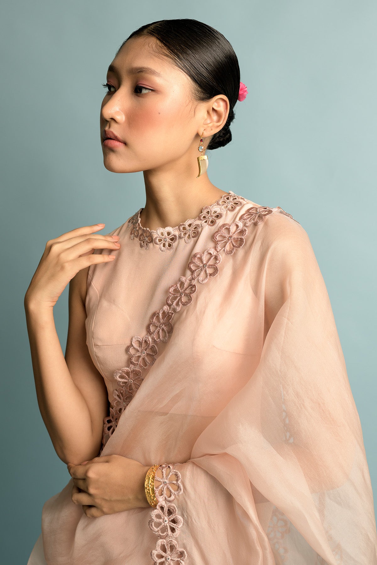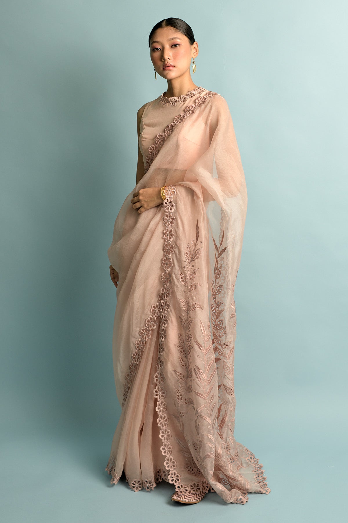 Salmon pink organza saree with salmon pink embroidery inspired by ivy that is hand cut and highlighted with swarovski, salmon pink organza blouse with shantoon petticoat