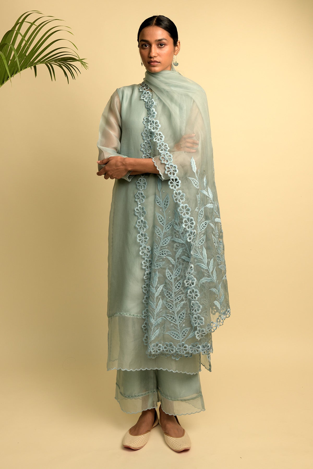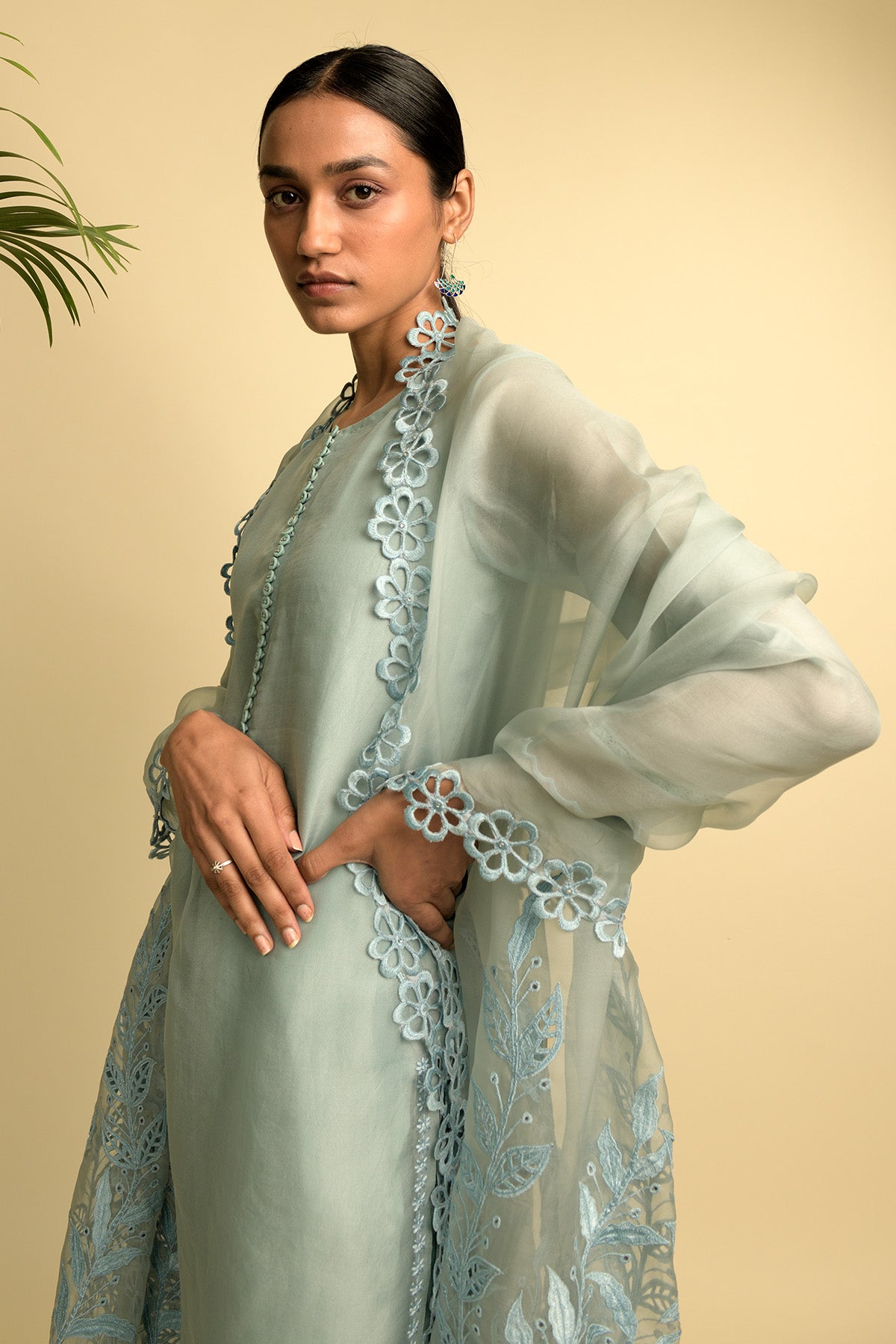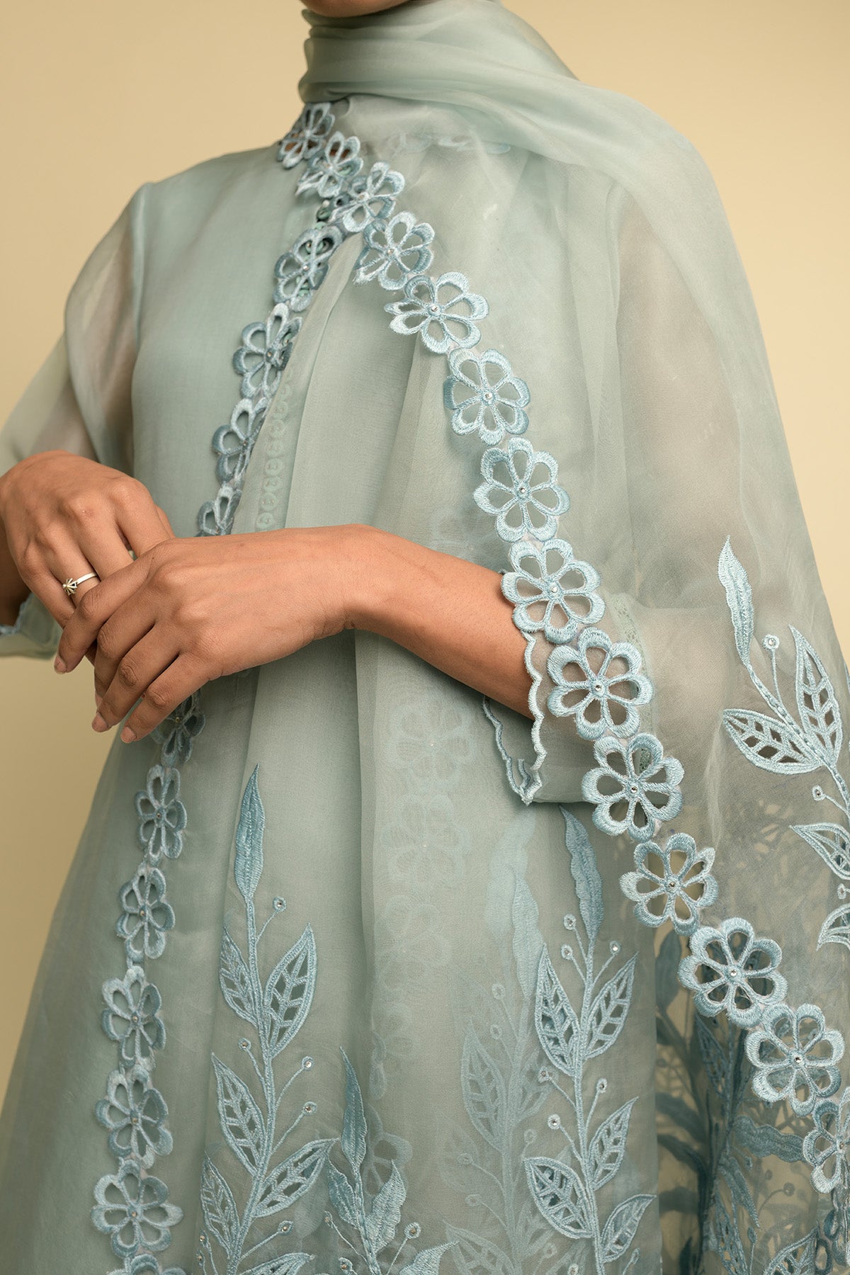 Sheer organza grey blue kurta with ivy inspired border, organza pants and organza dupatta embroidered and hand cut with swarovski crystals