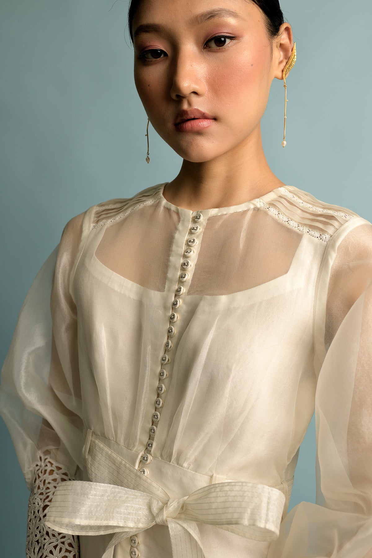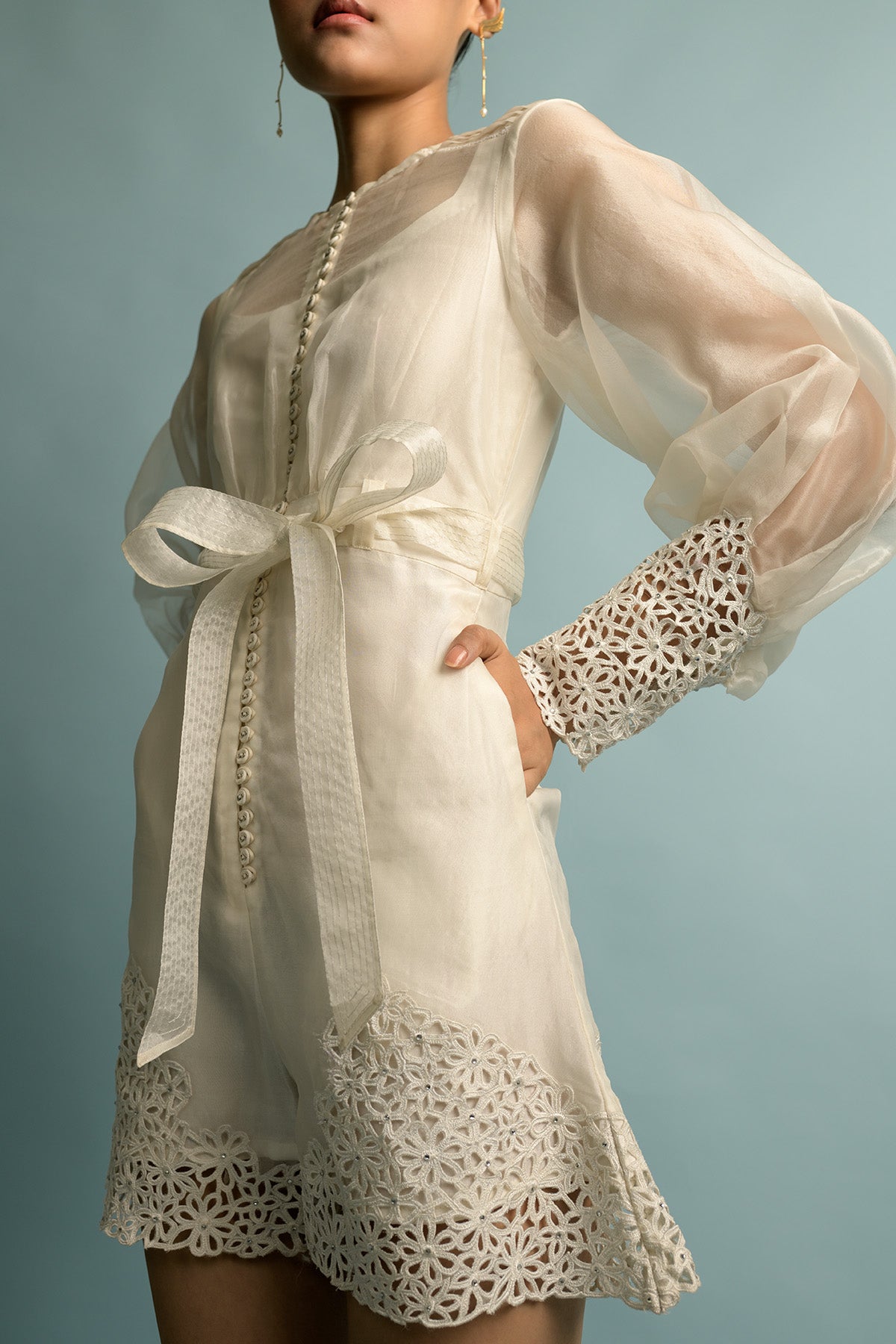White organza playsuit with white michaelmas daisy inspired embroidery, hand cut with swarovski crystal highlights