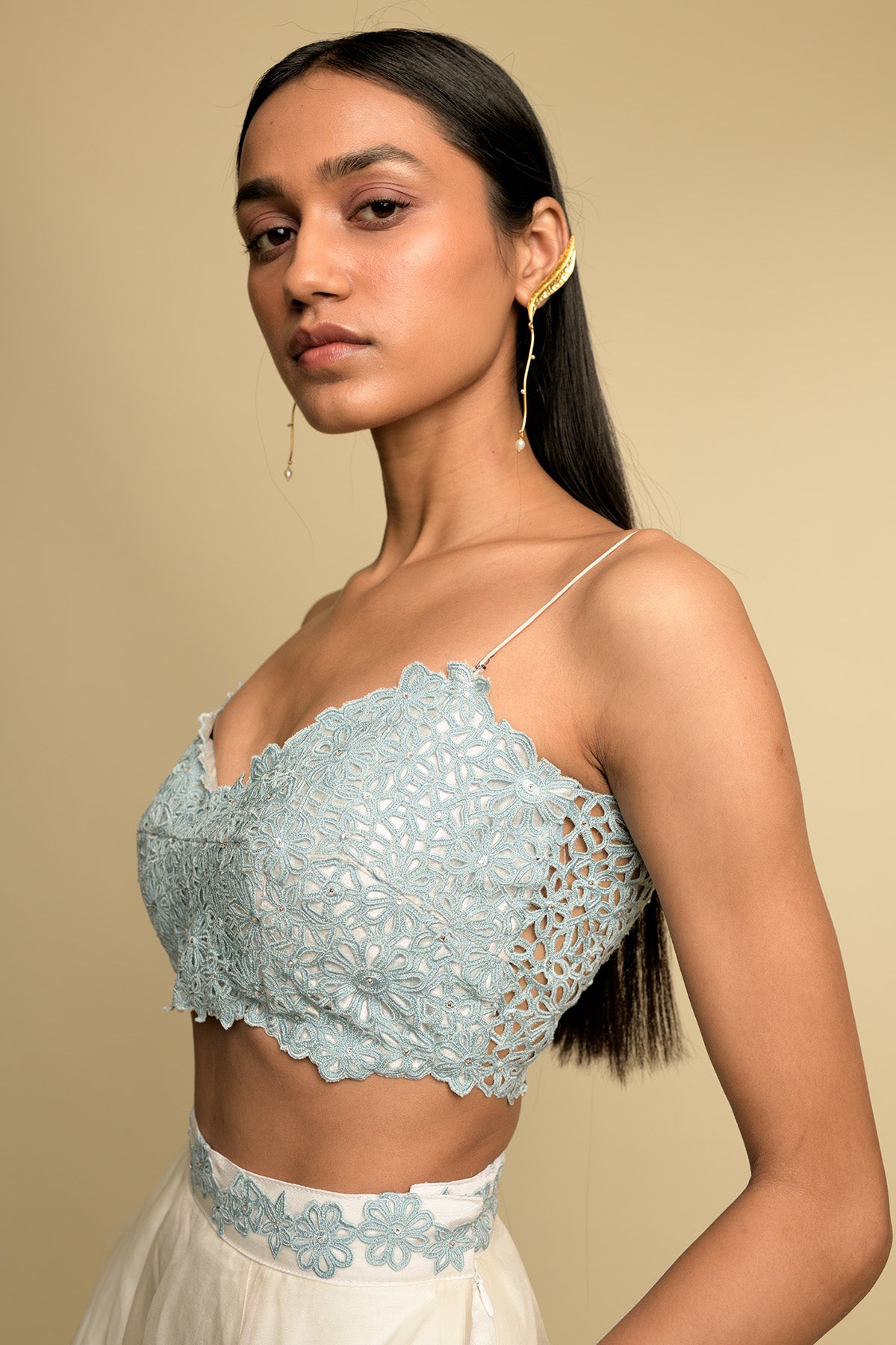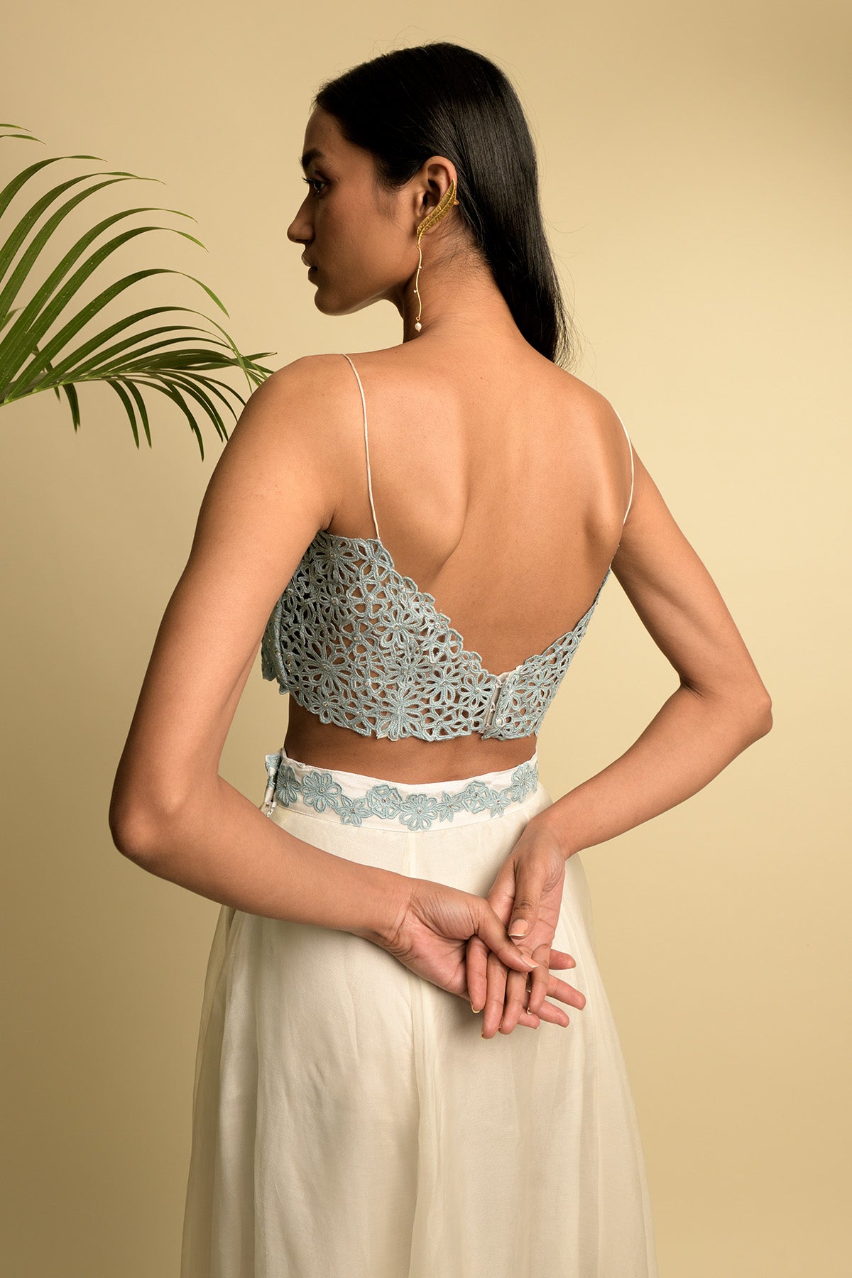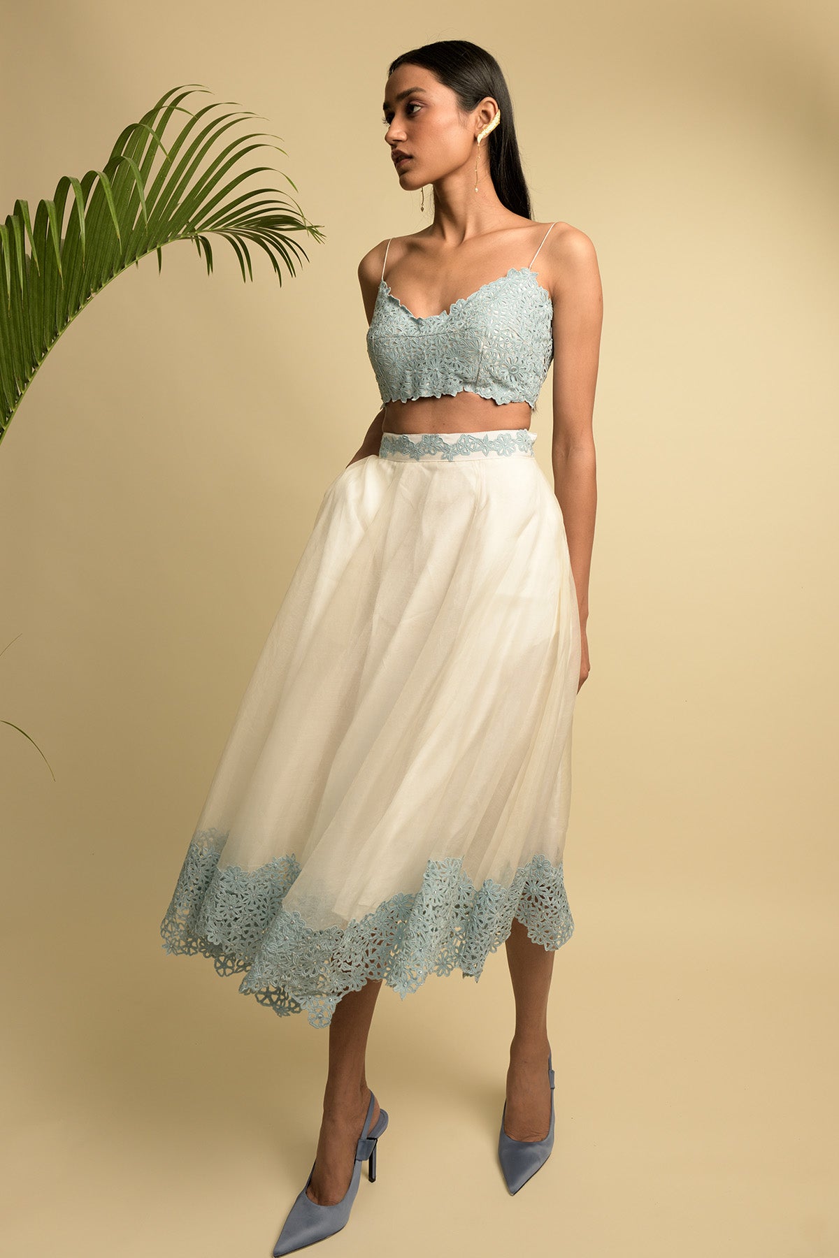 White organza skirt with blue embroidery inspired by michaelmas daisies hand cut with highlights of swarovski crystals, blue embroidered blouse hand cut and highlighted with swarovski