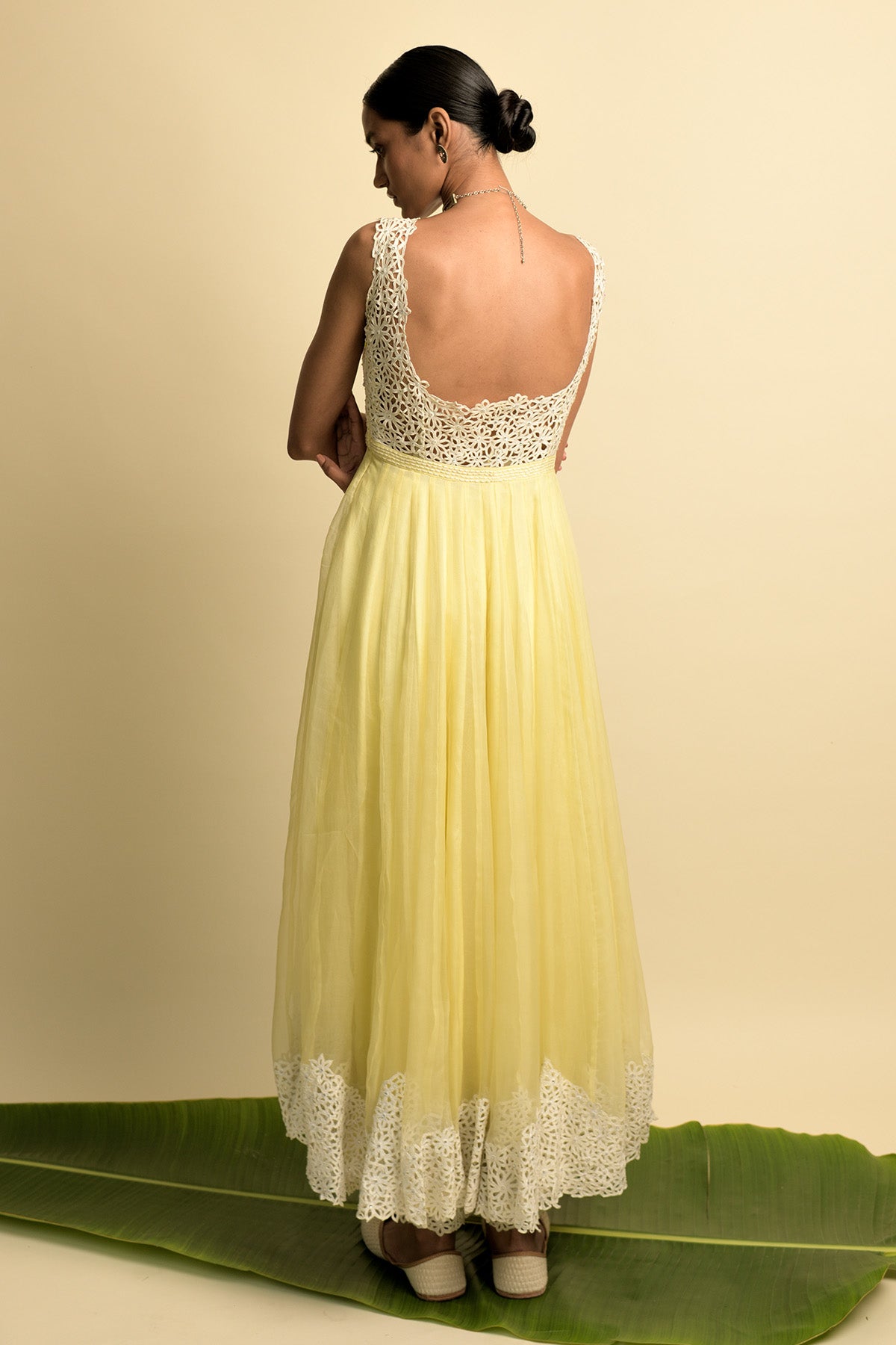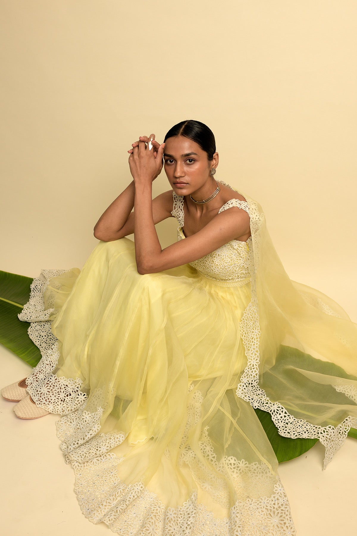 Yellow anarkali with 7m ghera, embroidery inspired by michaelmas daisies hand cut and highlighted with swarovski, organza pants and dupatta