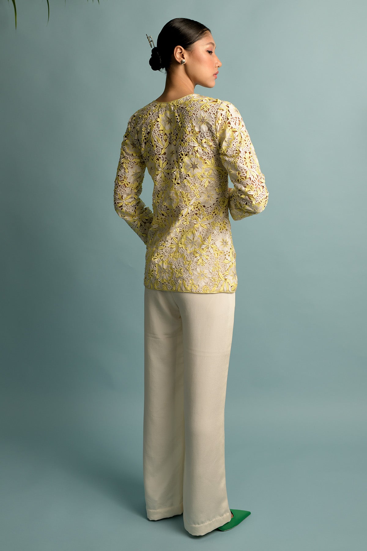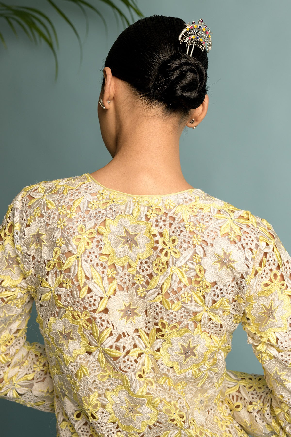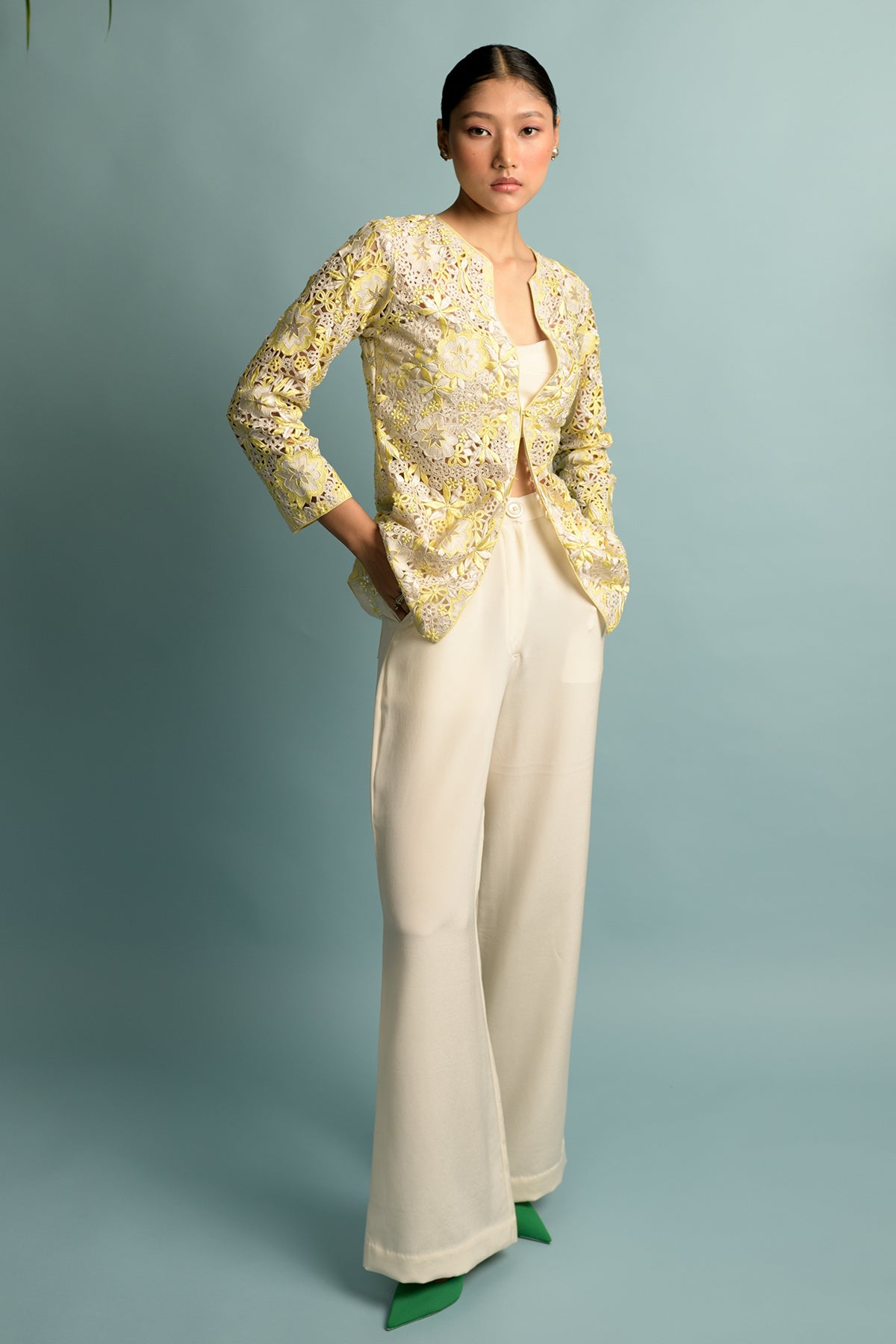 Yellow and white embroidery jacket inspired by cosmos, hand cut and highlighted with swarovski crystals, crepe bustier and crepe pants